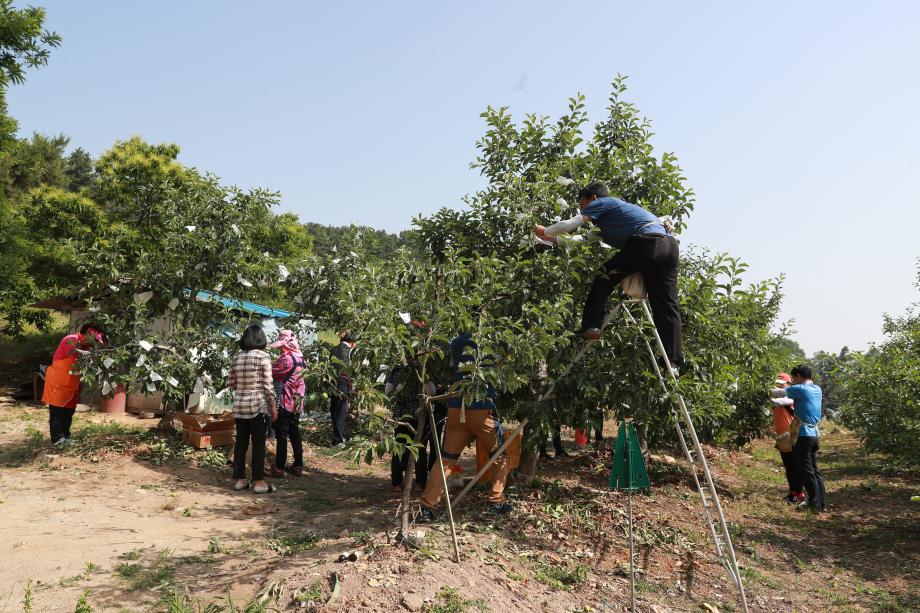 증평읍주민자치위원회(위원장 연태희)가 과수 적과시기를 맞아 부족한 일손을 돕기 위해 4일 증평읍 남하리 일원의 복숭아 재배 농가를 찾았다.
