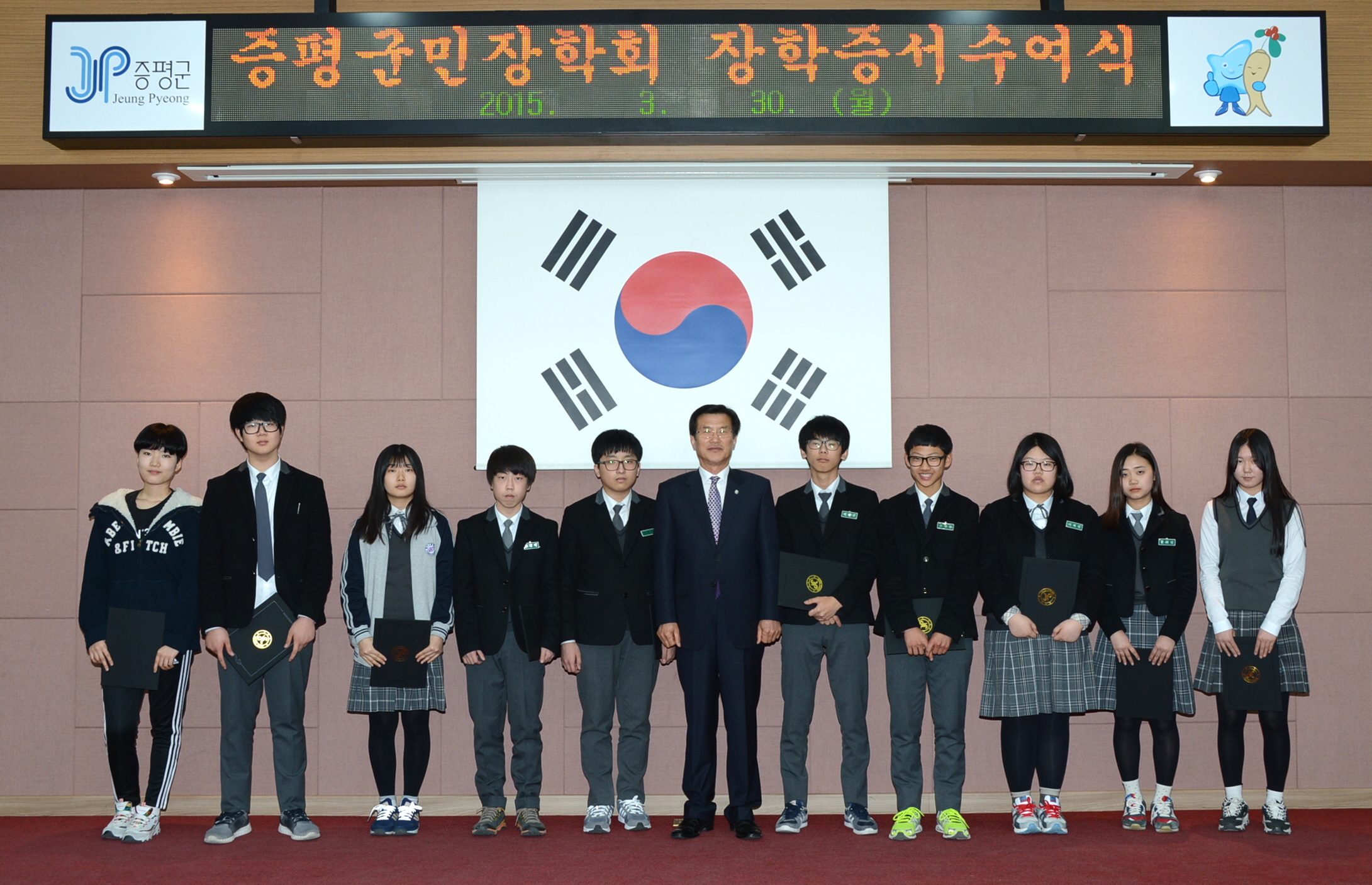 재단법인 증평군민장학회(이사장 홍성열 증평군수)는 30일 증평군청 대회의실에서 2015년 입학성적 우수장학생 장학증서 수여식을 가졌다. [보도자료실 참조]
