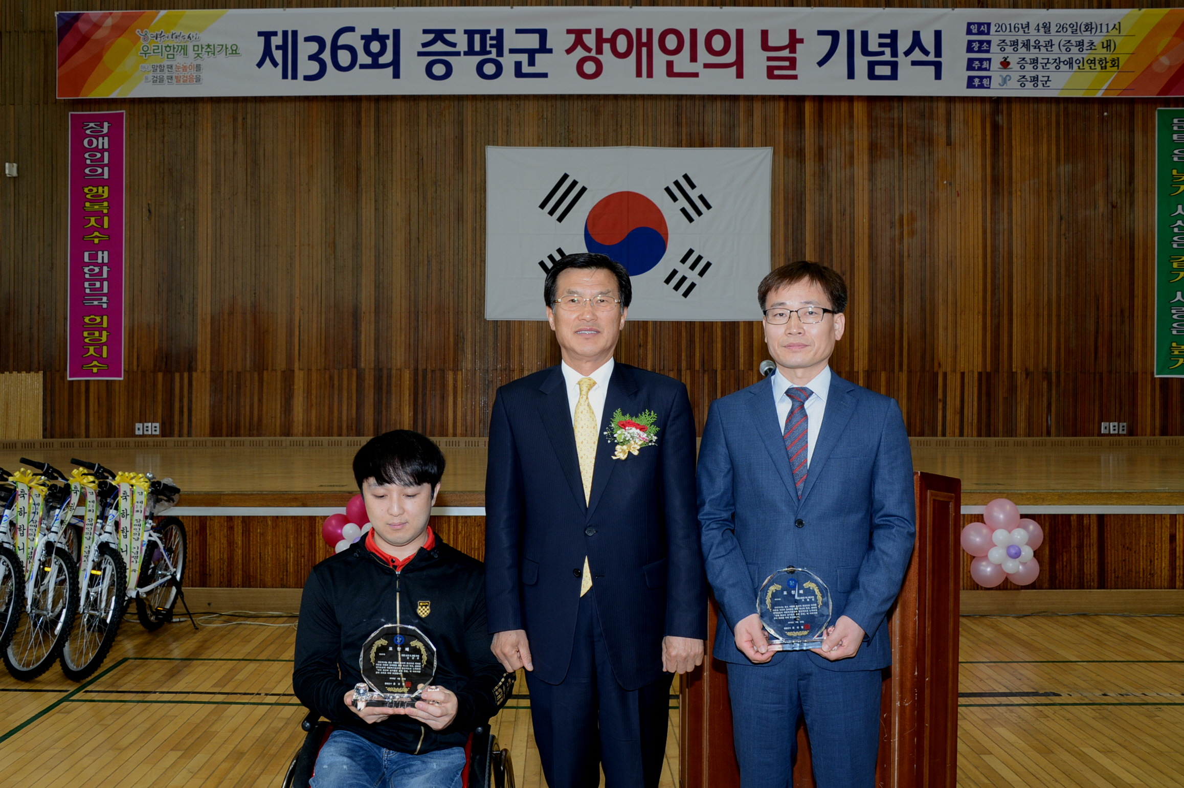 제36회 장애인의 날 기념행사가 26일 오전 11시 증평체육관에서 증평군장애인연합회(회장 연영찬) 주관으로 홍성열 증평군수, 우종한 군 의장을 비롯해 장애인 가족 등 700여명이 참석한 가운데 열렸다.(보도자료실 참조)