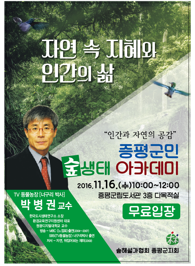 충북숲해설가협회 증평군지회(회장.안원훈)는 오는 16일(수) 오전10시 증평군립도서관 3층 다목적실에서 ‘너구리 박사’로 알려진 박병권 한국도시생태연구소장을 초빙해 증평군민 숲 생태 아카데미를 연다.(보도자료실 참조)