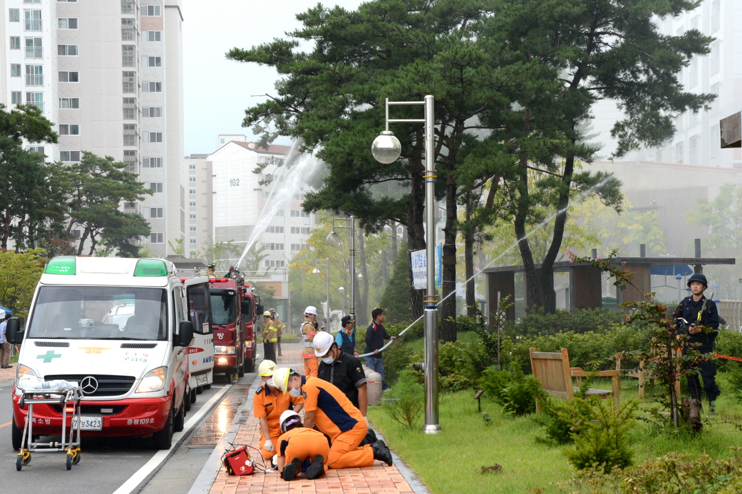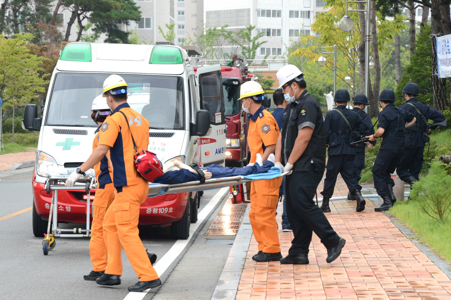 증평군은 19일 오후3시 평시 완벽한 국가 비상대비 태세를 확립하기 위해 실시되는 2014 을지연습의 일환으로 증평읍 송산휴먼시아 2단지에서 8개 유관기관․단체와 합동으로 고층아파트 미사일 피폭에 따른 전재민 구호훈련을 실시했다. [보도자료실 참조]