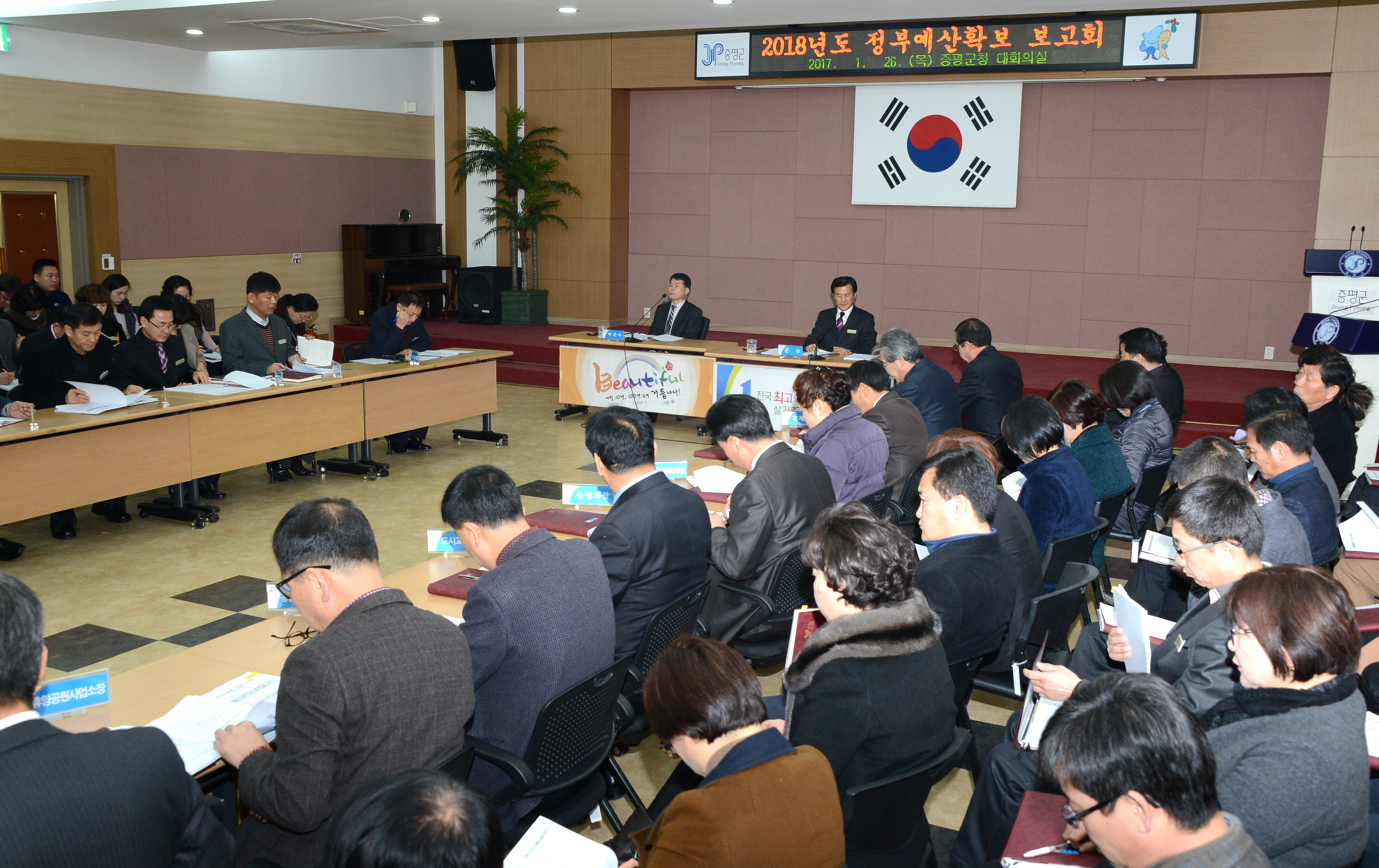증평군은 26일 군청 대회의실에서 홍성열군수 주재로 각 부서장과 팀장, 담당자 등 100여명이 참석한 가운데 정부예산확보 및 신속집행 추진계획 보고회를 가졌다.[보도자료실 참조]