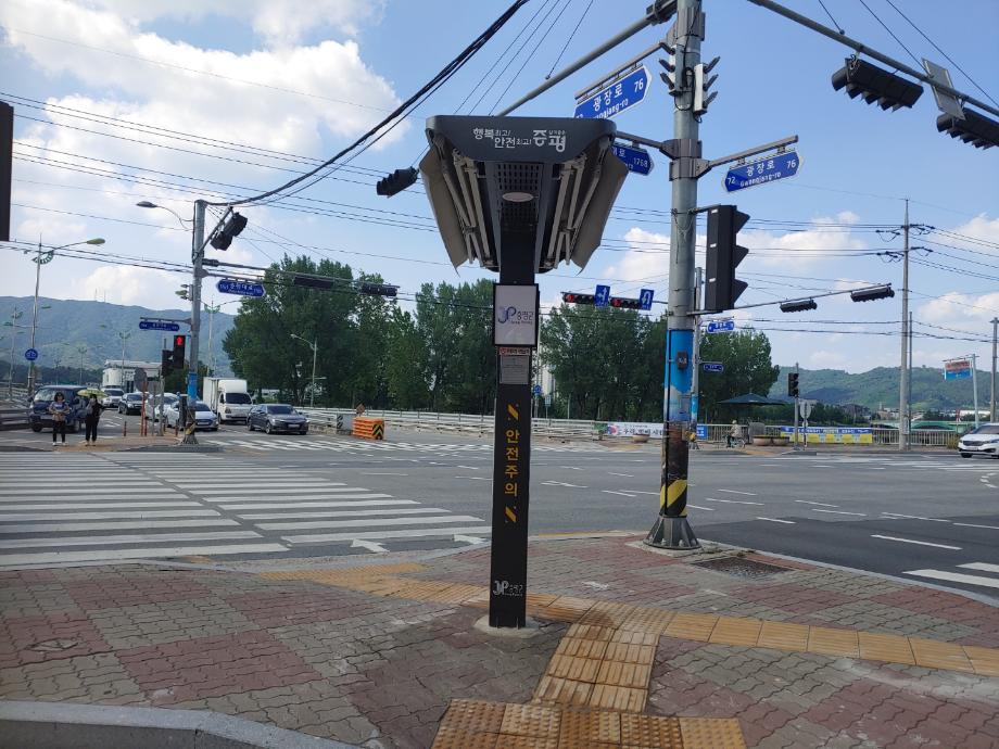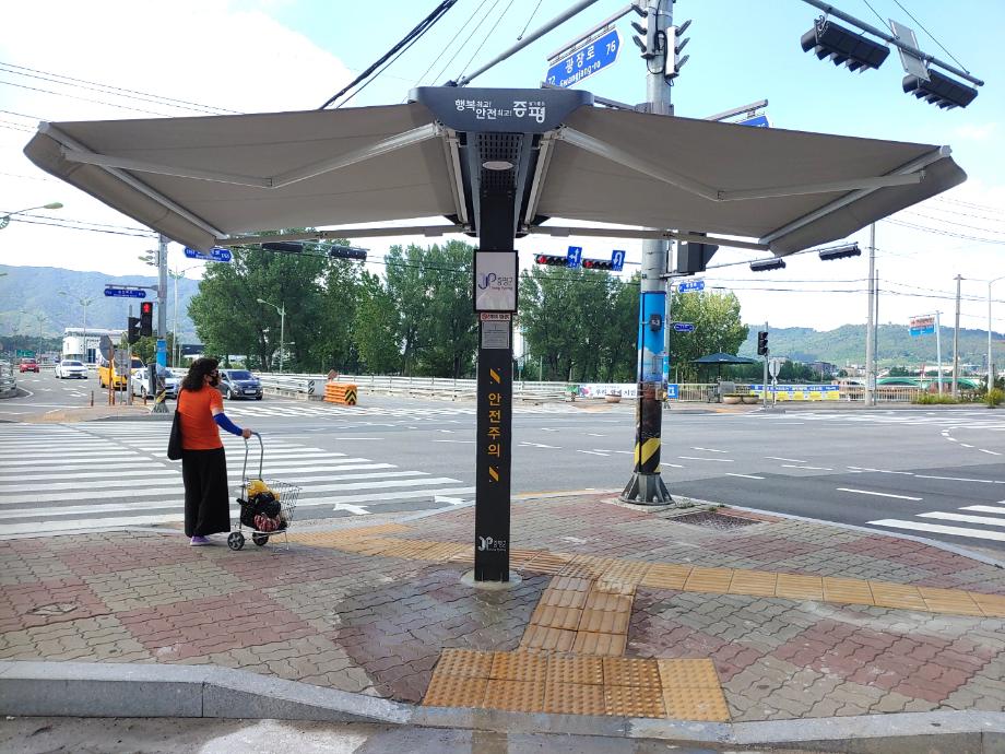 증평군이 유동 인구가 많은 횡단보도 대기 장소에 스마트 그늘막을 추가 설치했다.
