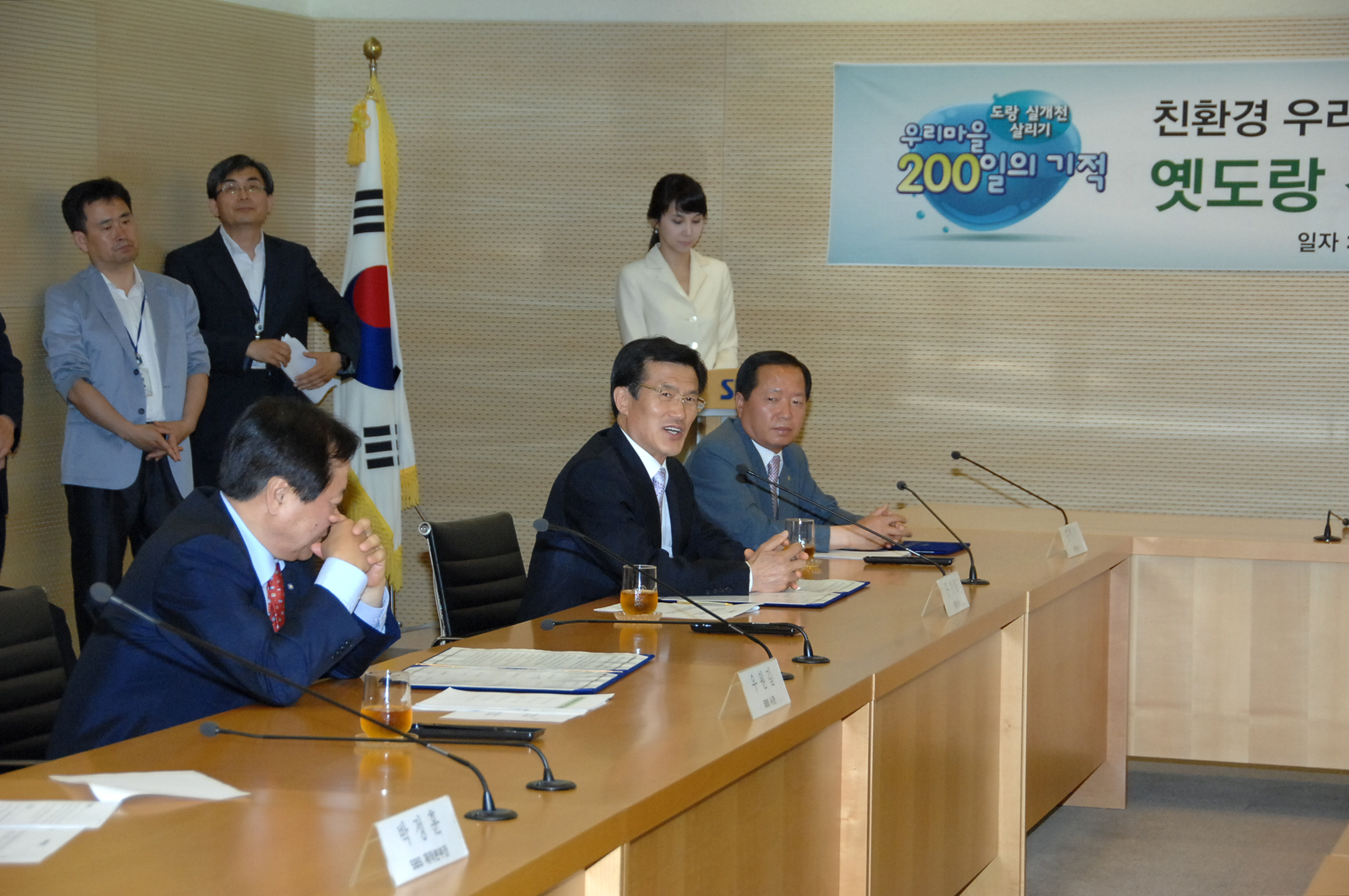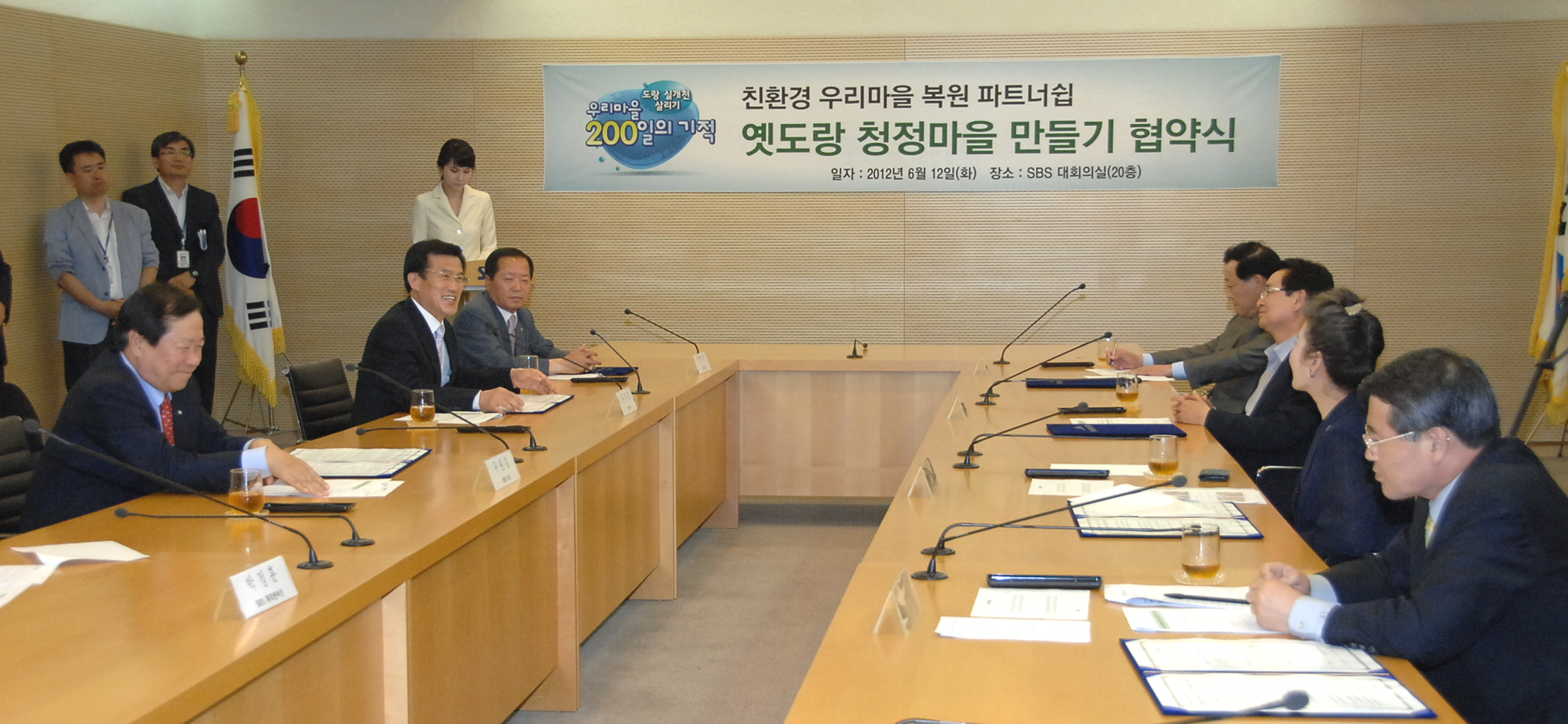 12일 SBS 서울 목동사옥 대회의실에서는 환경부, SBS, 농협중앙회, 증평군 등이 참여한 가운데 옛 도랑 청정마을 만들기 협약식이 열렸다.[사진 맨위는 왼쪽부터 우원길 SBS사장, 홍성열군수, 유영숙 환경부장관.보도자료실 참조]
