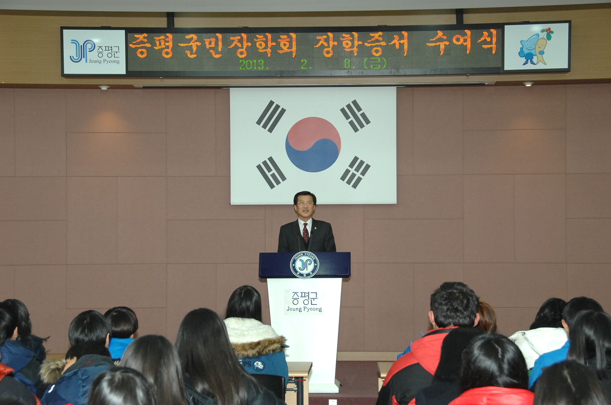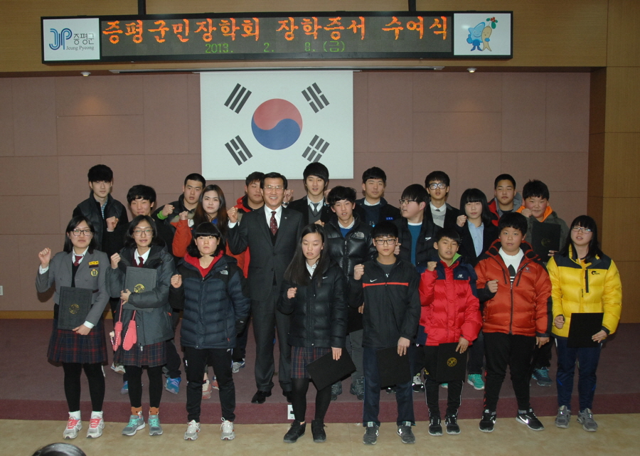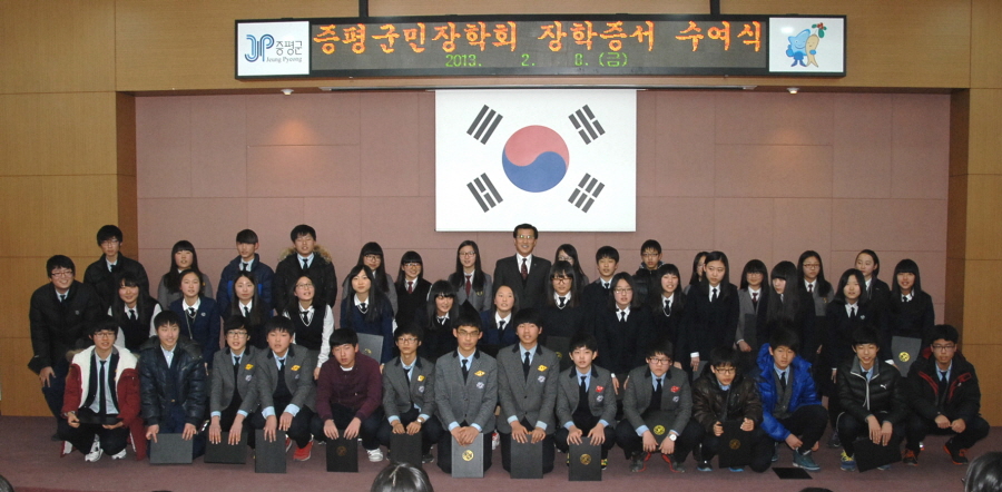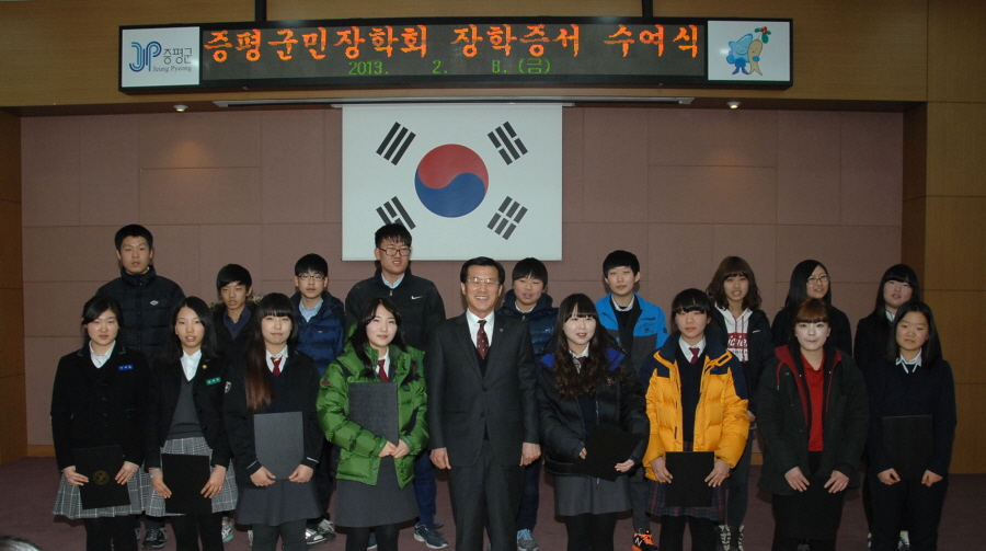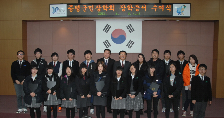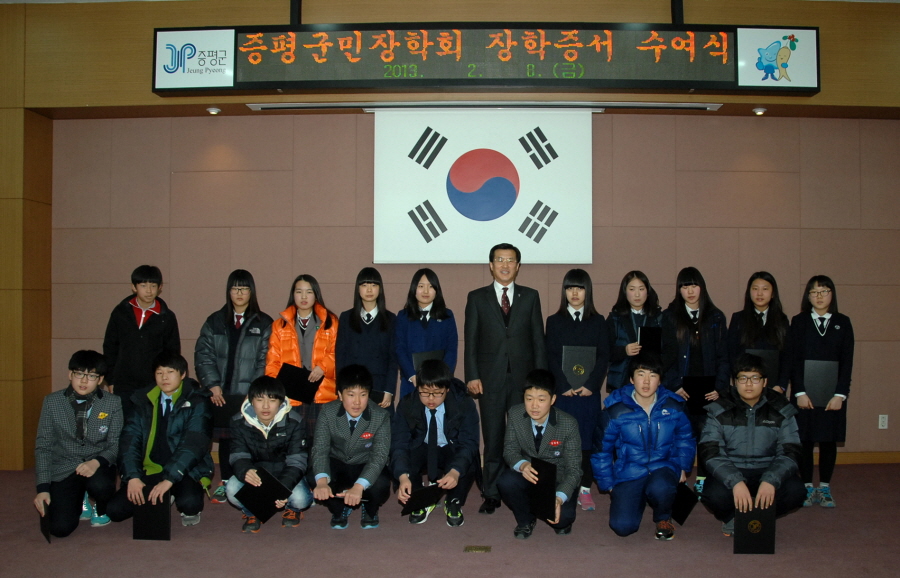 (재)증평군민장학회(이사장 홍성열군수)는 8일 군청 대회의실에서 2013년 제1차 장학증서 수여식을 갖고 총 160명의 학생에게 6980만원의 장학금을 전달했다.[보도자료실 참조]