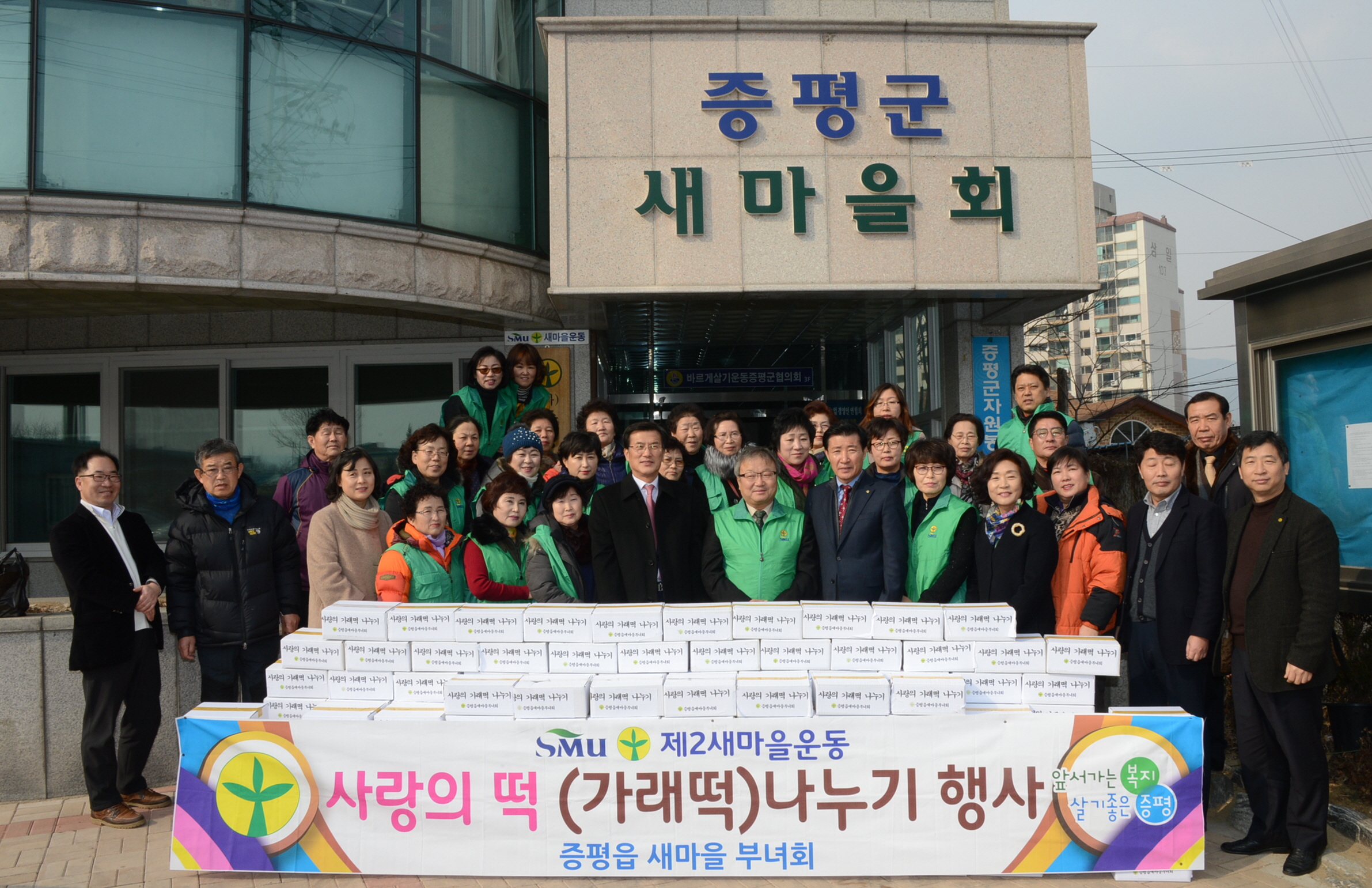 증평군새마을회(회장 권영만)는 증평읍새마을부녀회(회장 김금자)주관으로 27일 오후 1시 증평군새마을회관 앞에서 증평읍새마을부녀회원 50명이 참석한가운데 신년 맞이 사랑의 가래떡 나누기행사를 가졌다.(보도자료실 참조)
