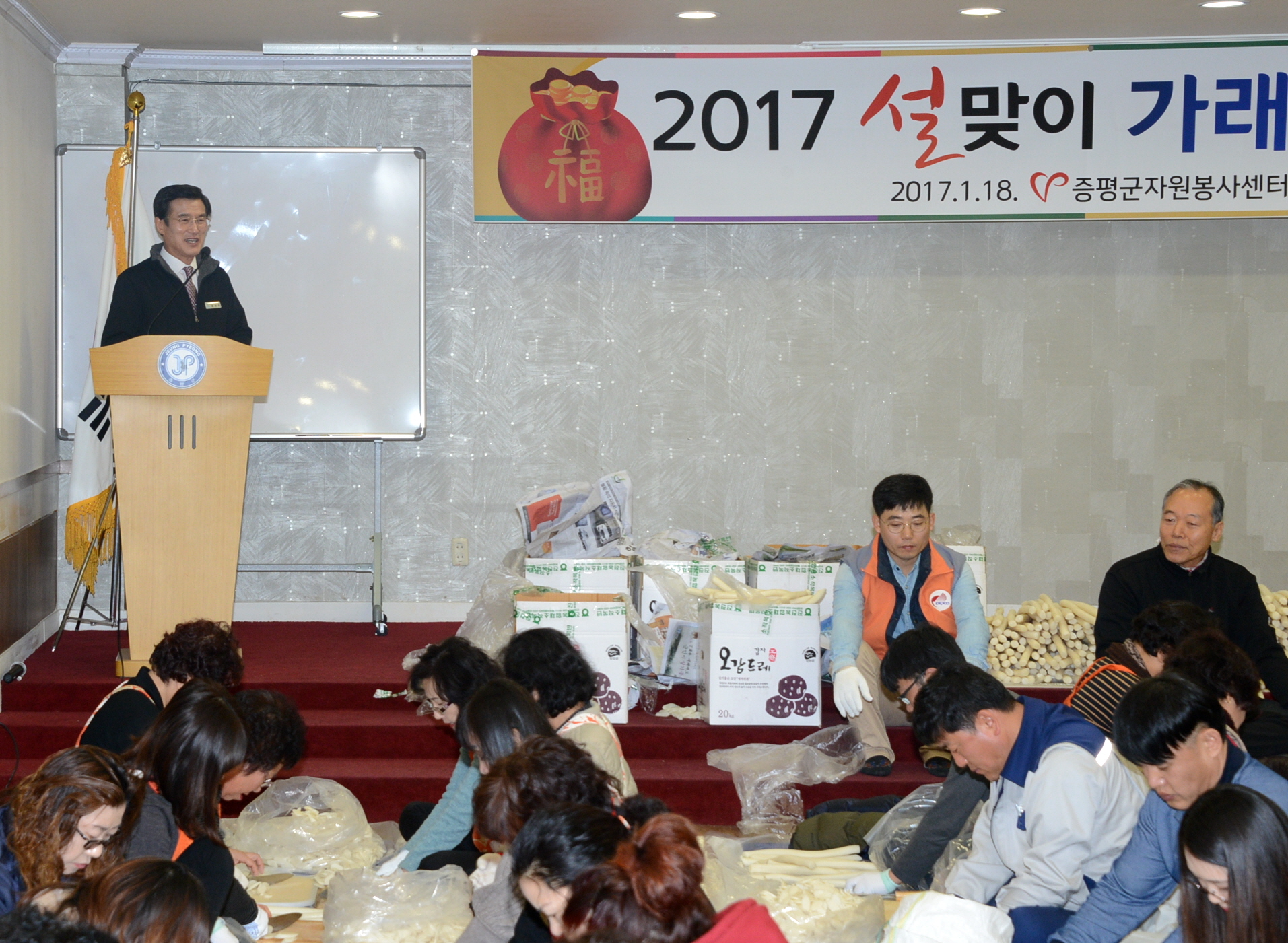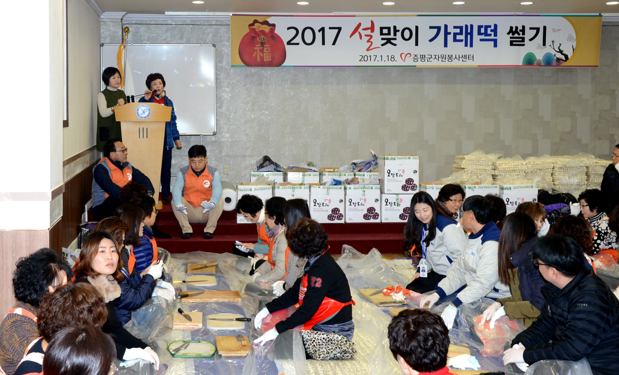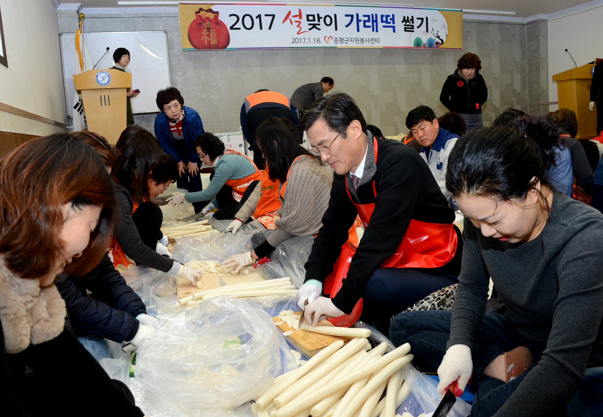 증평군자원봉사종합센터(센터장.김남순)는 18일 오전 10시 증평군 여성회관에 100여명의 기업봉사자와 여성단체 회원, 자원봉사자들이 참여한 가운데 지역사회 소외계층을 위한‘설맞이 사랑의 떡썰기 행사’를 가졌다.[보도자료실 참조]