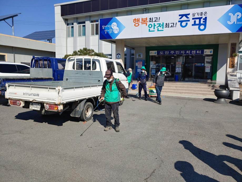 증평군새마을회(회장 박병천)이 ‘코로나19 예방 증평군민운동’세 번째 릴레이 주자로 참여, 18일 다중이용시설에 대한 방역활동을 폈다.