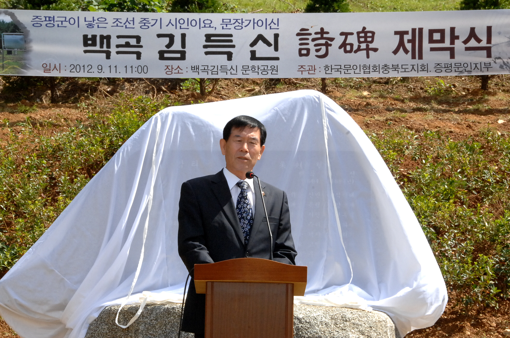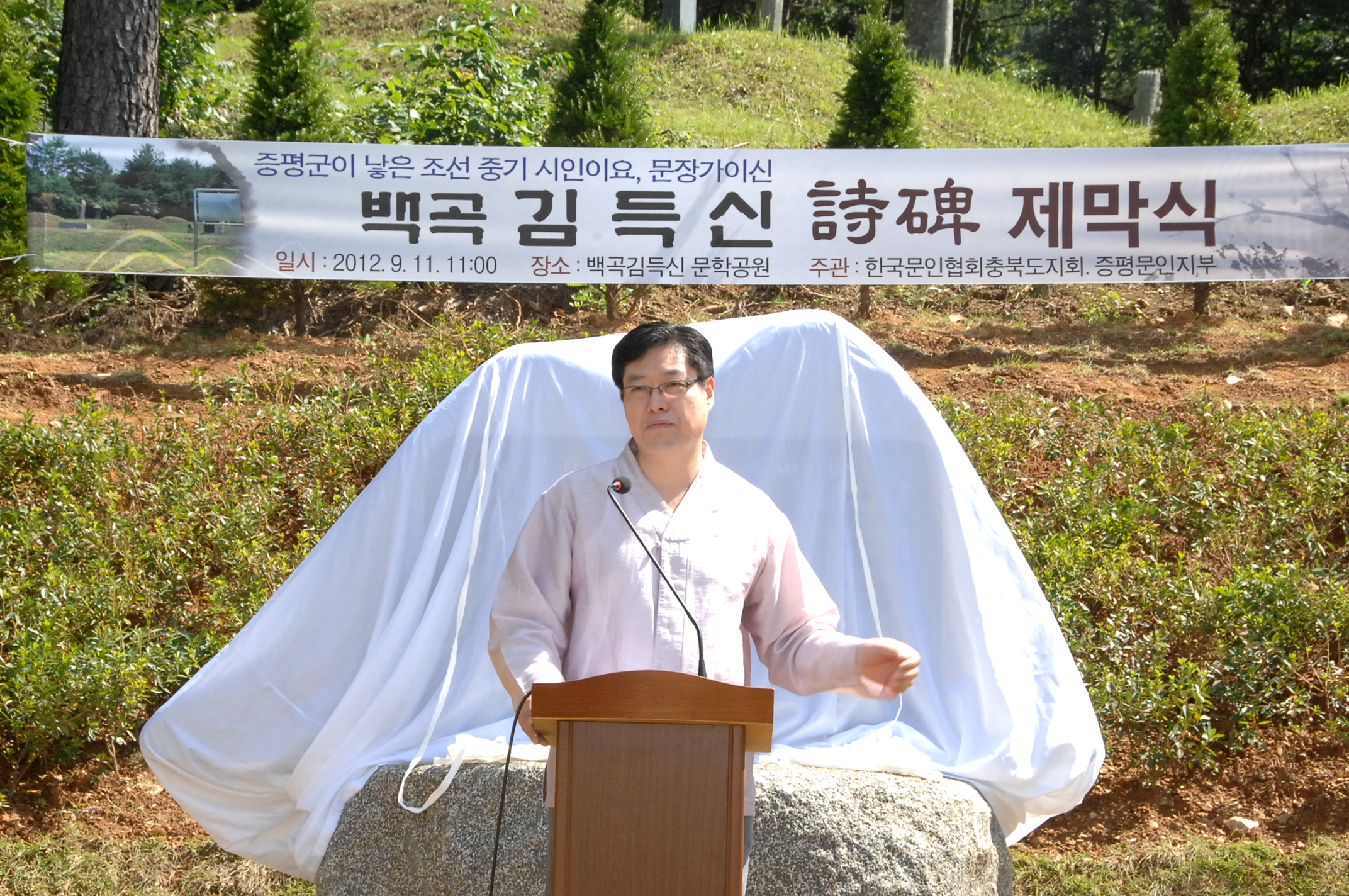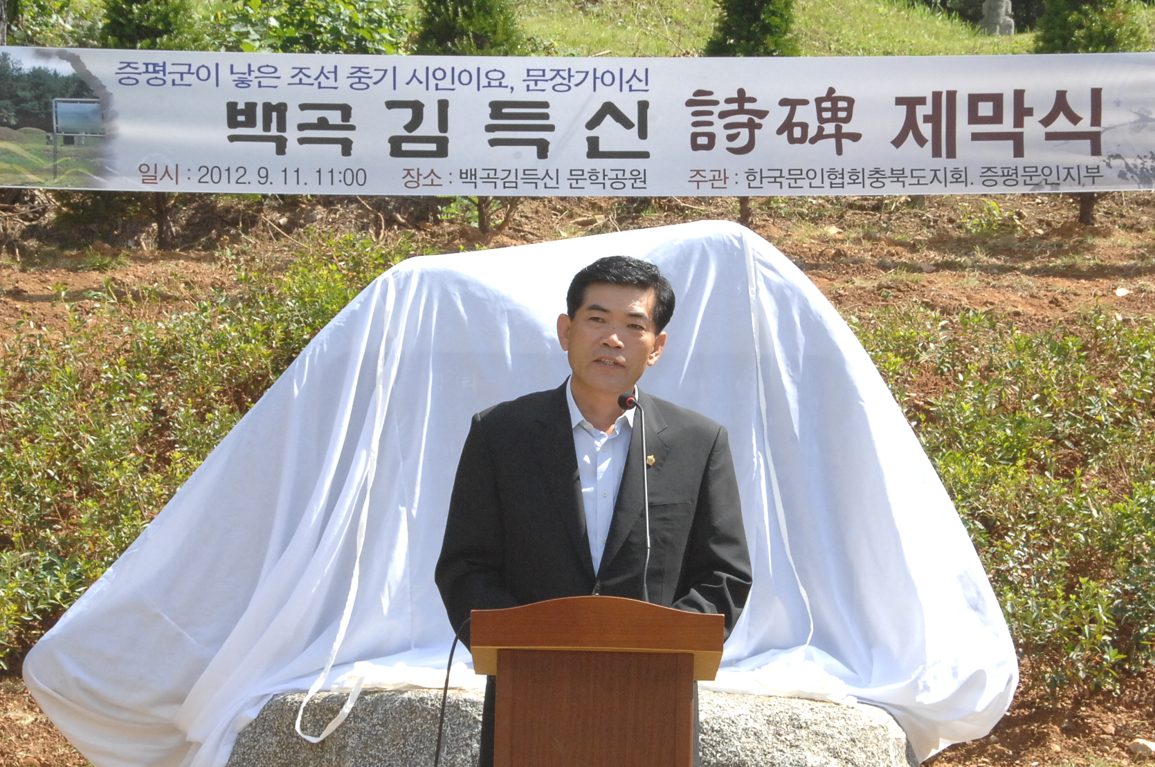 백곡(栢谷) 김득신(金得臣 1604~1684) 선생의 생애와 작품을 기리고 지역 주민들의 긍지와 자부심을 고양하기 위한 시비(詩碑) 제막식이 11일 오전 11시 증평읍 율리 선생의 묘소 인근에 조성된 김득신 문학공원에서 열렸다. [보도자료실 참조]