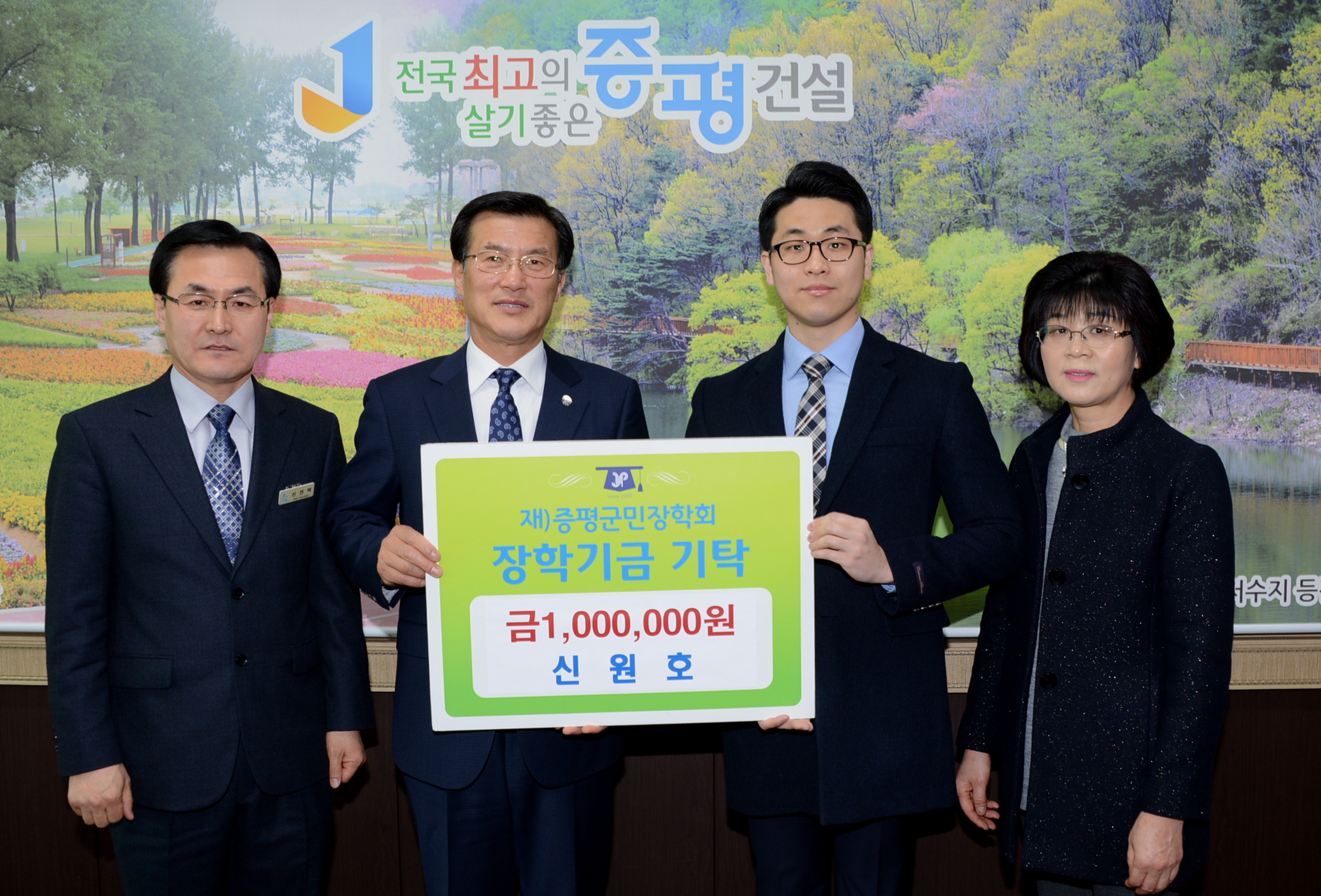 제65기 경찰간부후보생시험에 합격한 증평군 증평읍의 신원호(25)씨가 증평지역의 인재육성을 위해 써달라며 (재)증평군민장학회(이사장 홍성열 증평군수)에 100만원의 장학기금을 기탁했다.(보도자료실 참조)