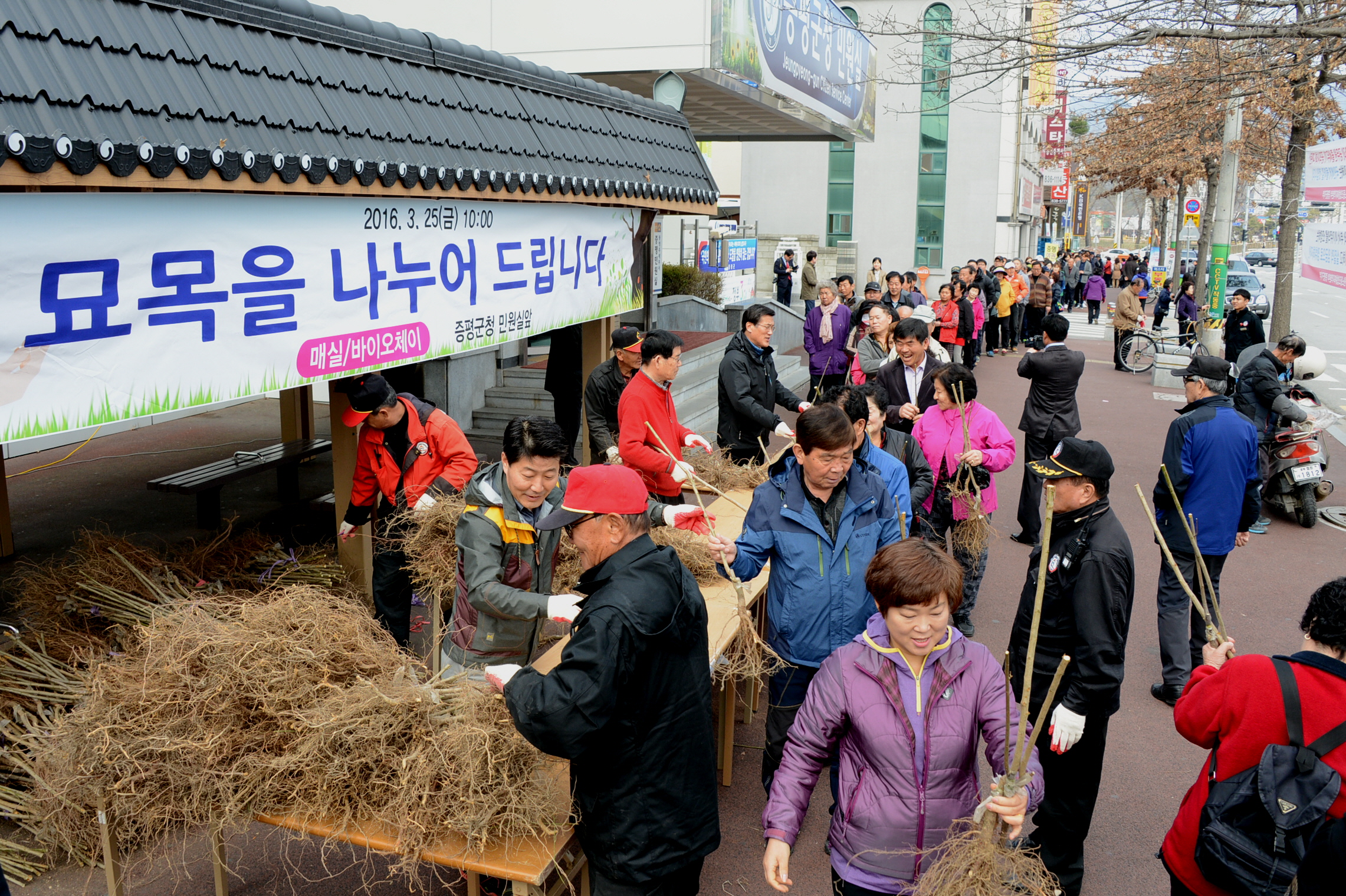 증평군은 제71회 식목일을 기념해 25일 오전 10시 군청 민원실 앞에서 ‘나무 나눠주기’행사를 갖고, 1인당 3그루씩(매실2, 바이오체리1) 총1,500그루를 주민 500명에게 나눠줬다.(보도자료실 참조)