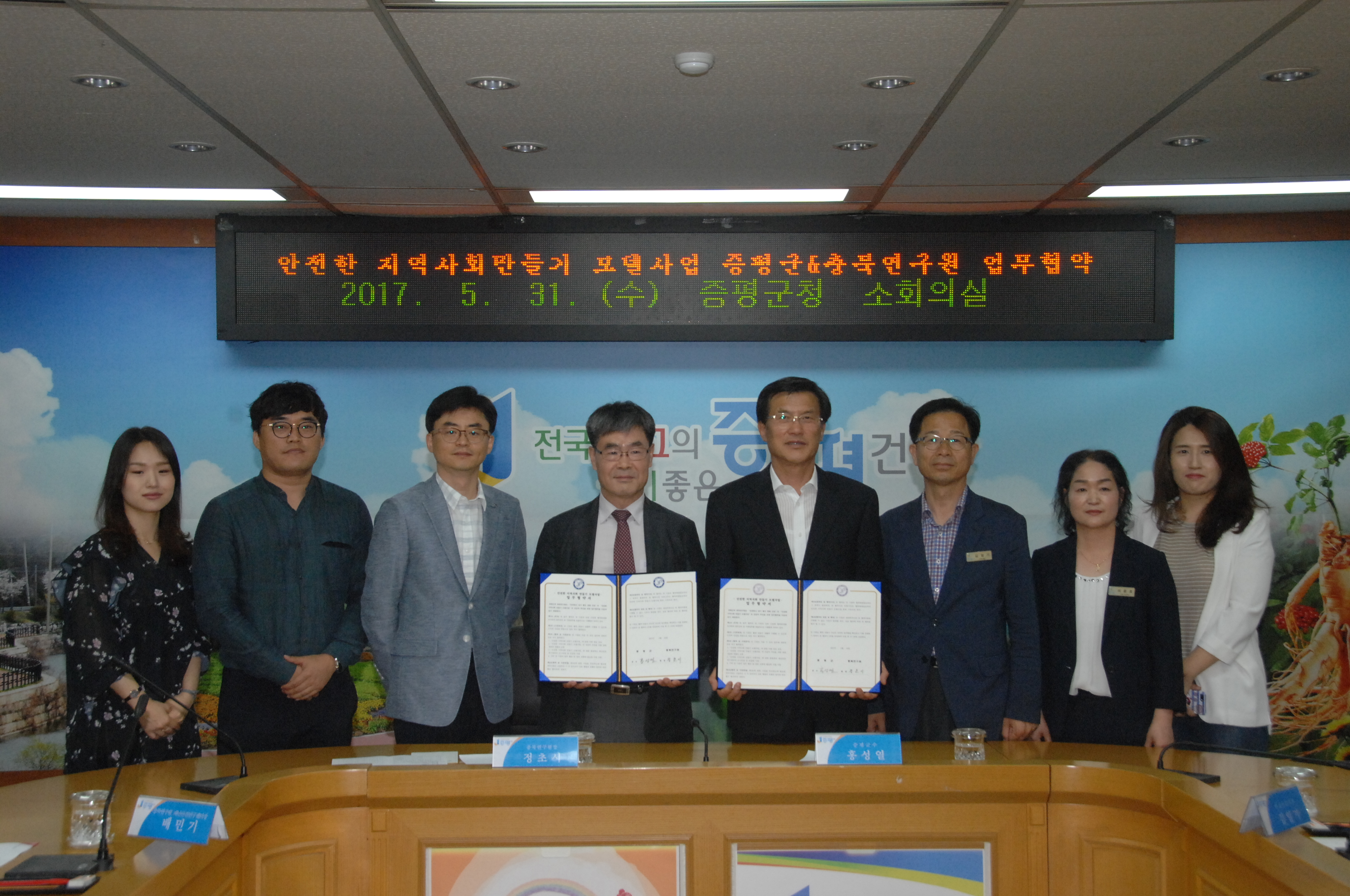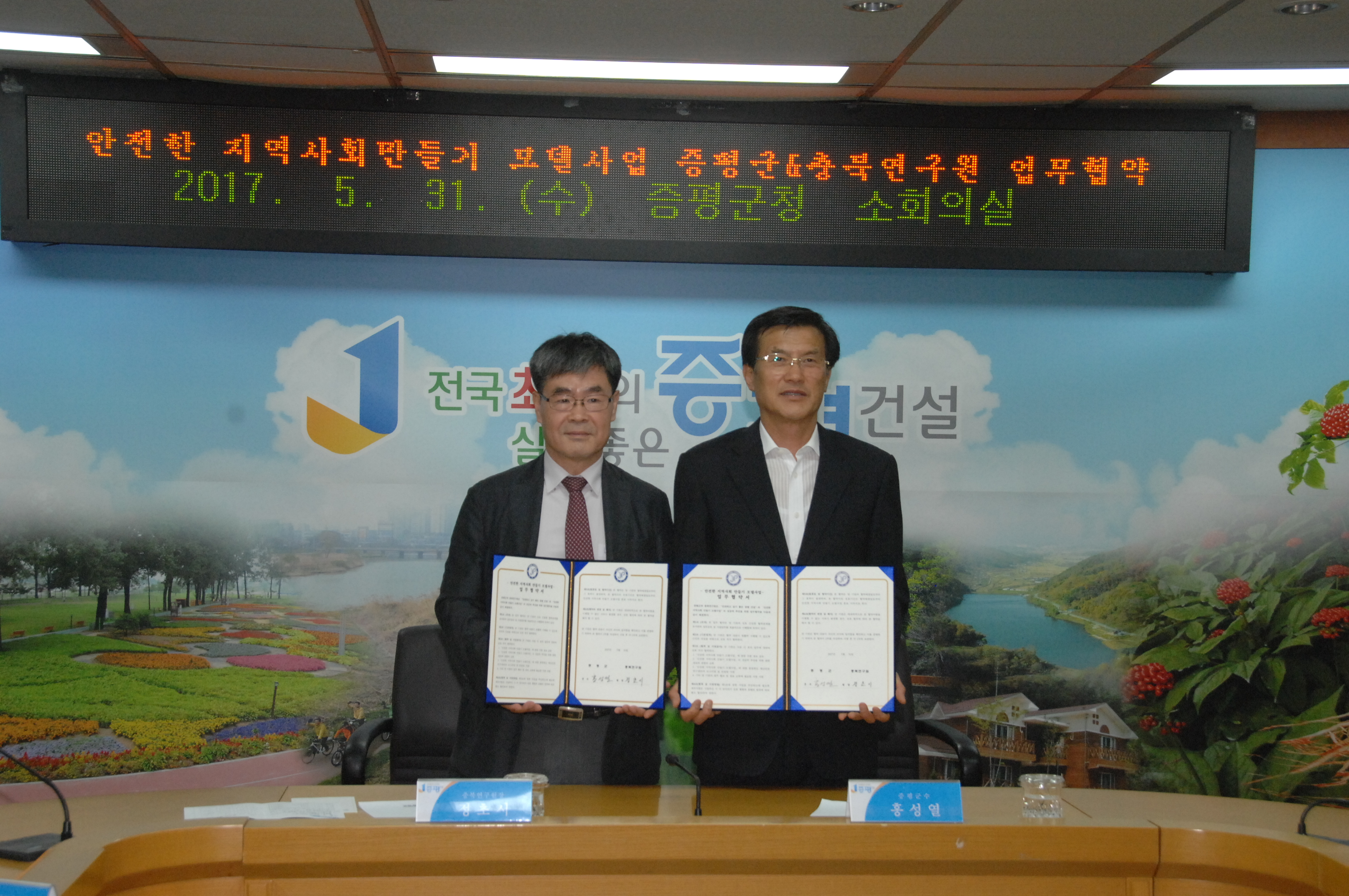 증평군과 충북발전연구원은 31일 증평군청소회의실에서 홍성열군수와 정초시 충북연구원장이 참석한 가운데 안전한 지역사회 만들기 모델사업 거버넌스 구축을 위한 업무협약을 체결했다.