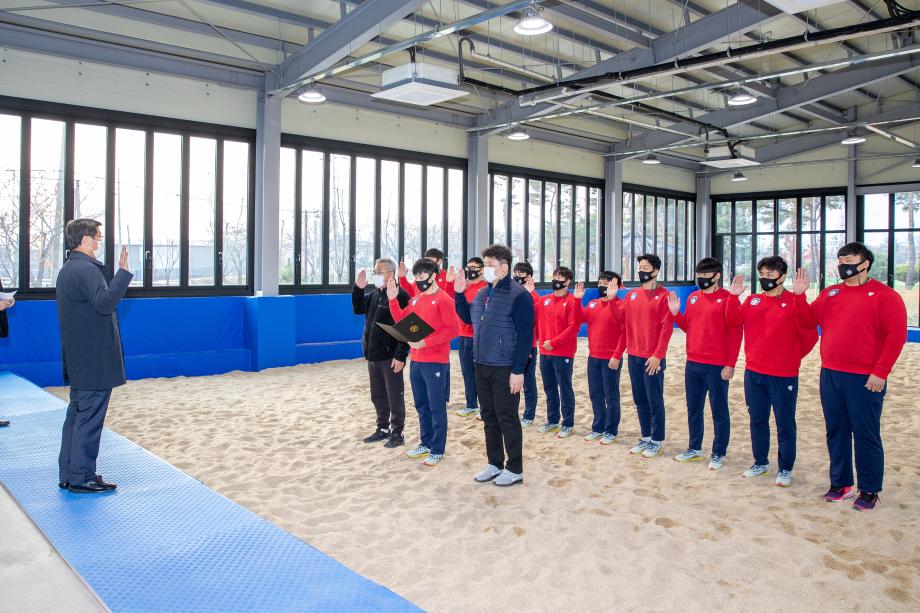 증평군청인삼씨름단 선수단 12명은 13일 증평군인삼씨름장에서 씨름단장인 홍성열 군수가 함께한 가운데 스포츠 폭력추방 결의를 다졌다.