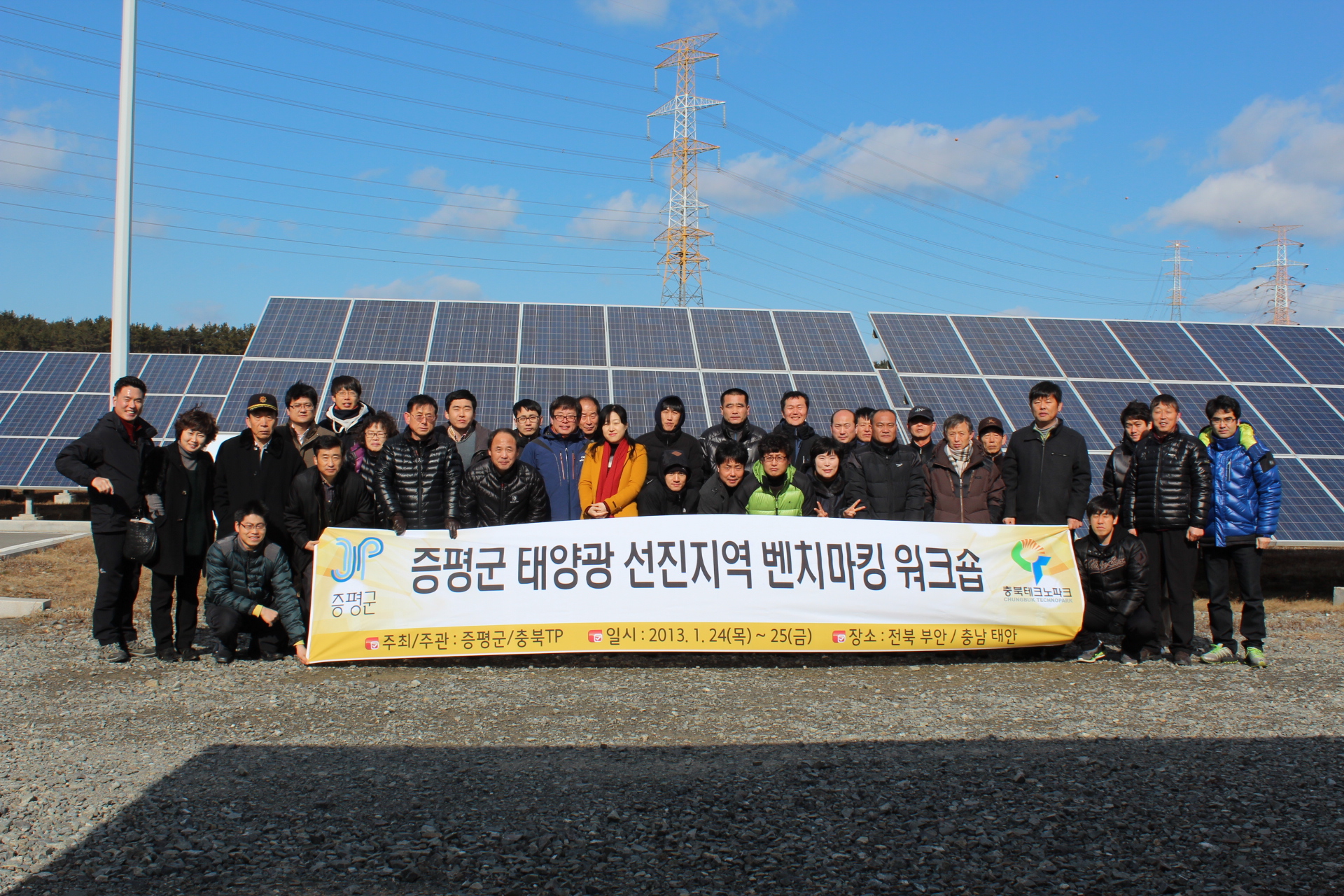 증평군의 ‘솔라시티 지역혁신 역량강화사업’을 주관하는 (재)충북테크노파크는 24일부터 25일까지 1박2일간 총37명을 대상으로 전북 부안군 신재생에너지테마파크, 충남 태안군 LG태양광발전소 등 선진지역 벤치마킹을 실시했다.[증평보도자료실 참조]