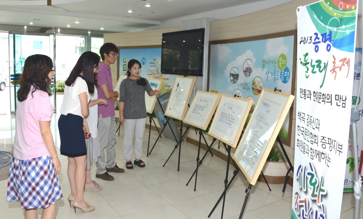 증평군은 한국문인협회 증평지부와 공동으로 군민이 많이 찾는 장소에 2013 증평들노래축제에 전시했던 시화 30여 작품을 올해 연말까지 순회 전시한다. 사진은 군청현관에 전시한 시화를 관람하는 모습이다.[보도자료실 참조]