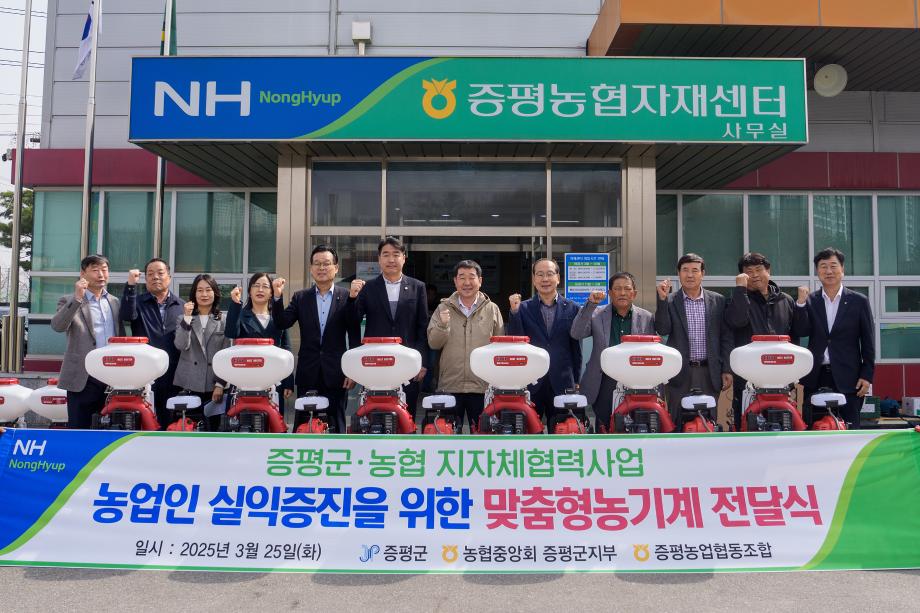 충북 증평군은 25일 증평농협 자재센터에서 증평농협(조합장 배종록)과 ‘증평군-농협 지자체 협력사업 농기계(비료살포기) 전달식’을 가졌다.