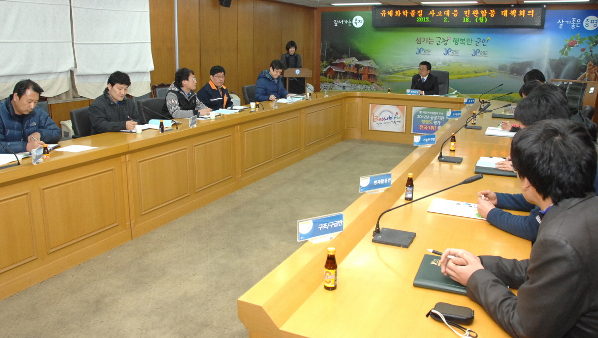 증평군은 18일 오전 10시 군청 2층 소회의실에서 군 관내 화학물질 사용 영업자와 환경관련 민간단체 등이 참석한 가운데 환경오염 방지 및 안전관리 협조체계 구축을 위한 회의를 가졌다.[보도자료실 참조]