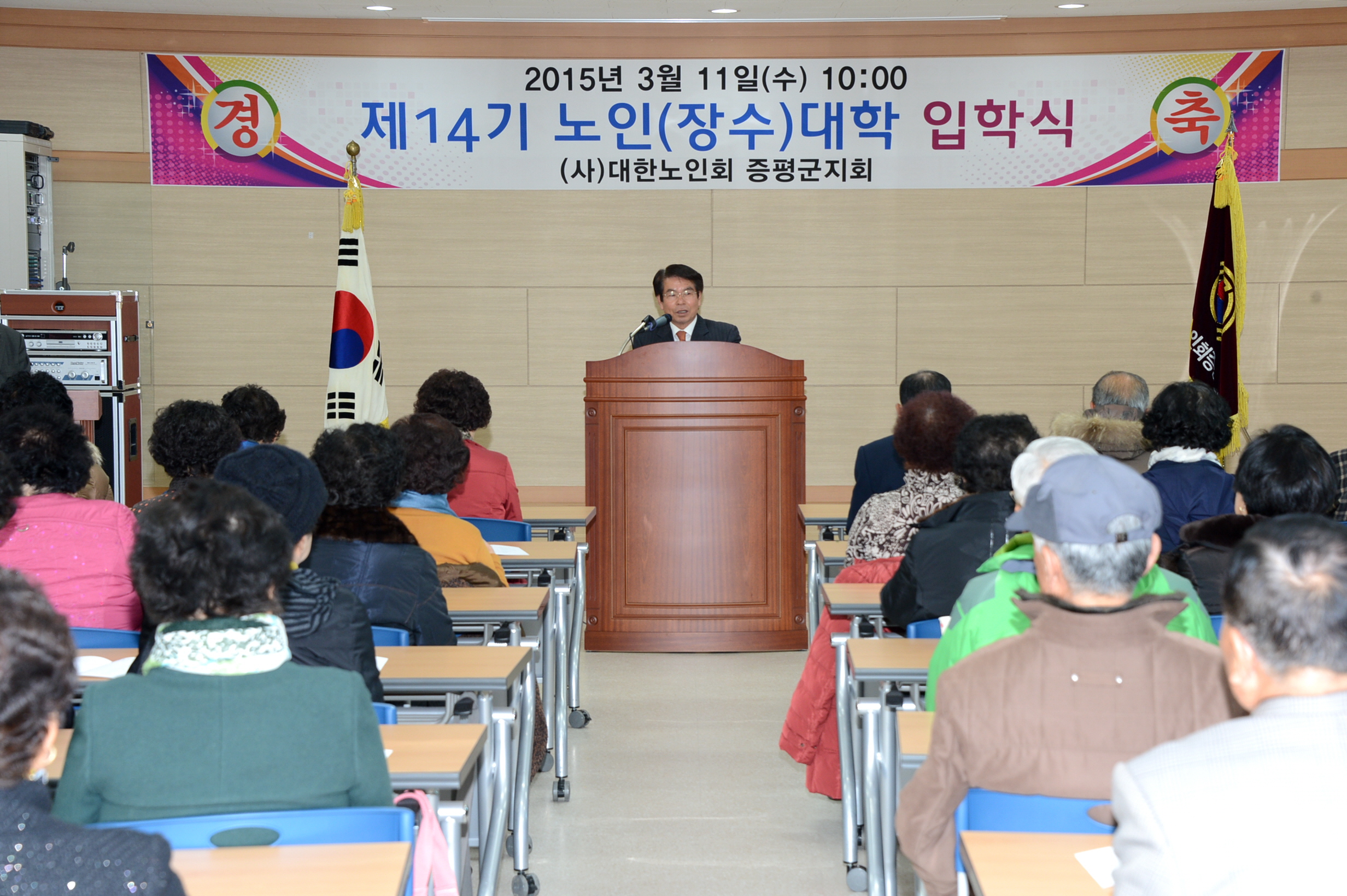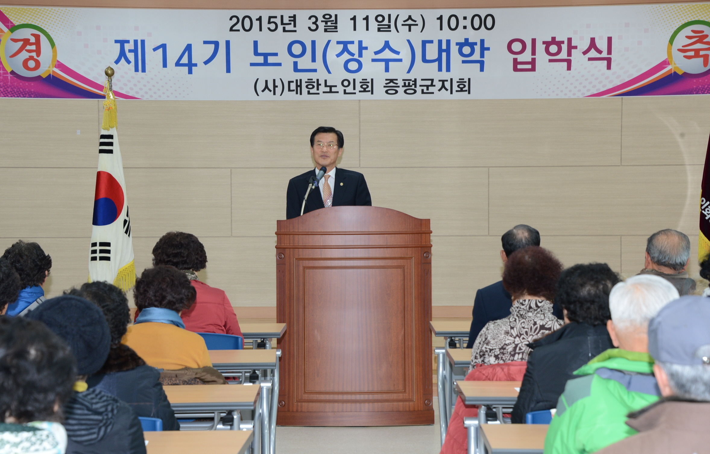 (사)대한노인회 증평군지회(회장 김재성)가 11일 오전 10시 증평군 노인회관 2층 강당에서 홍성열 군수, 지영섭 군의장을 비롯한 노인대학생 등 70여명이 참여한 가운데 14기 장수노인대학 개강식을 진행했다.