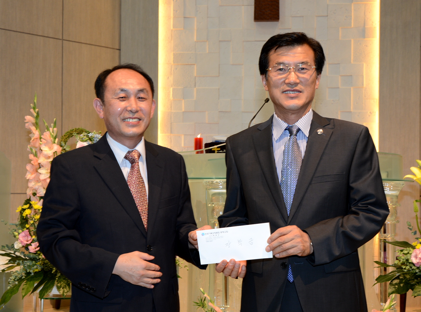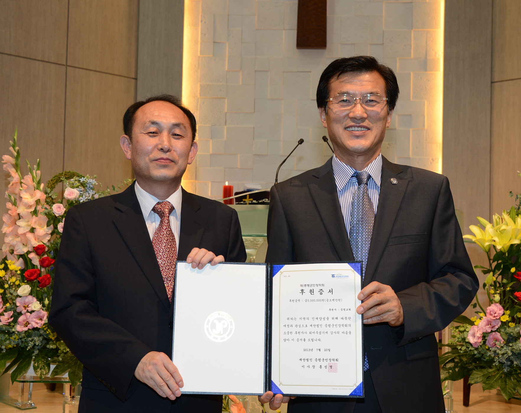 증평군 증평읍 대동리 소재 증평교회(담임목사 복영규)에서 20일 증평교회 창립 100주년 기념예배 중 지역인재양성을 위해 써달라며 재)증평군민장학회(이사장 홍성열)에 500만원을 장학기금으로 기탁했다. [보도자료실 참조]