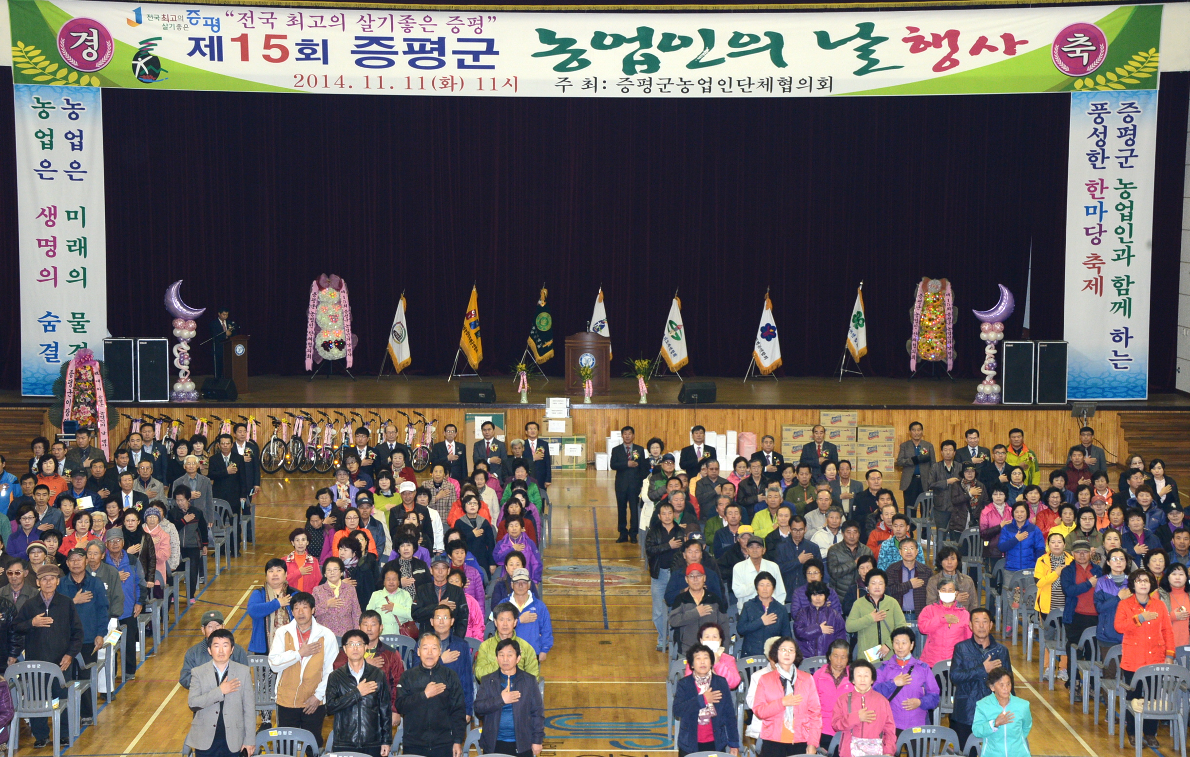 증평군은 11일 11시 증평군농업인단체(회장 이채희) 주최로 증평종합스포츠센터에서 홍성열 군수, 지영섭 군의장을 비롯한 각 기관단체장과 농업인 500여명이 참석한 가운데 제15회 증평군농업인의 날 행사를 열었다. [보도자료실 참조]
