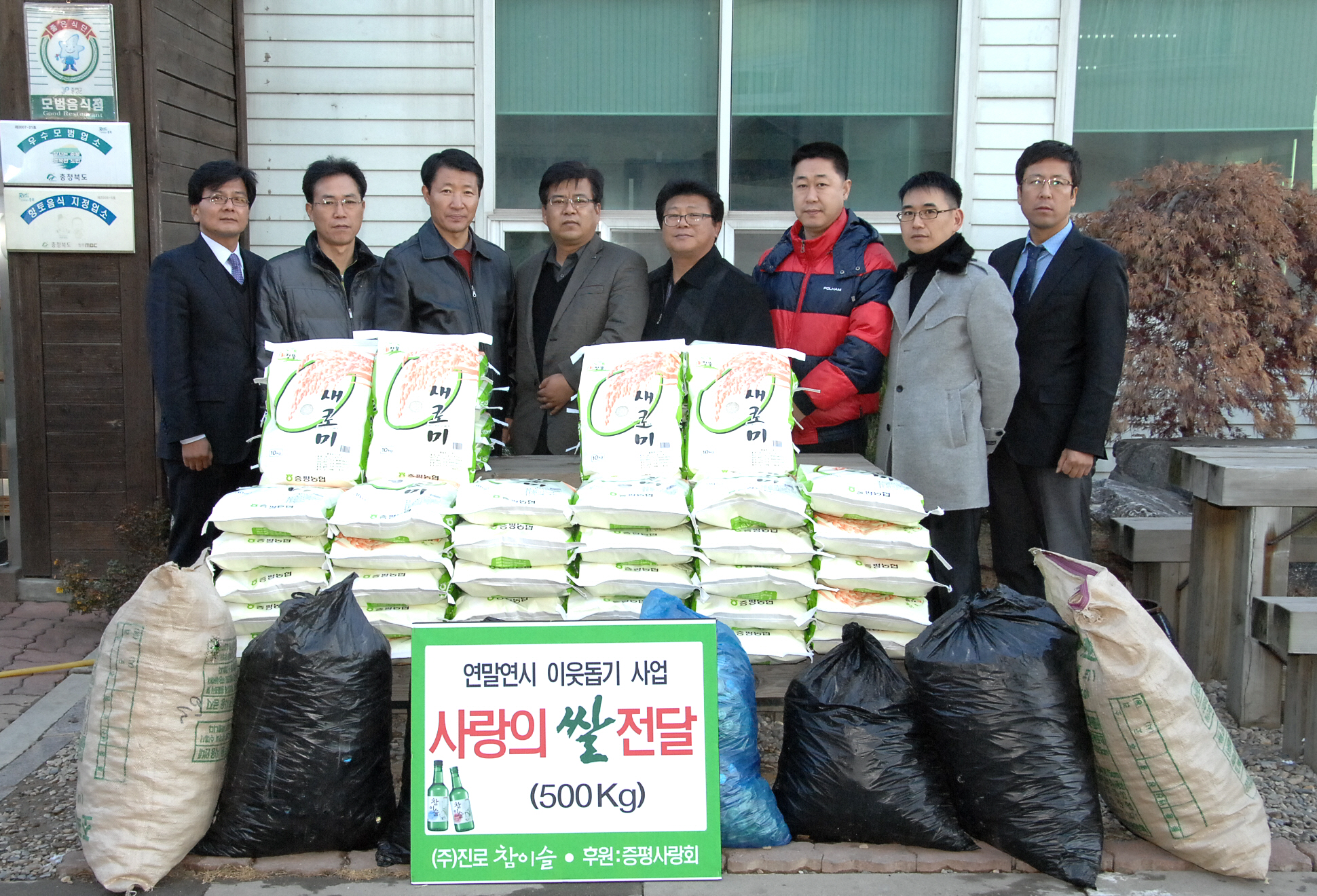 (주)진로 충북지점(지점장 한기종)과 증평사랑회(회장 엄대섭)는 15일 연말연시 이웃돕기를 위해 ‘사랑의 쌀’ 500kg을 기탁했다.[보도자료실 참조]
