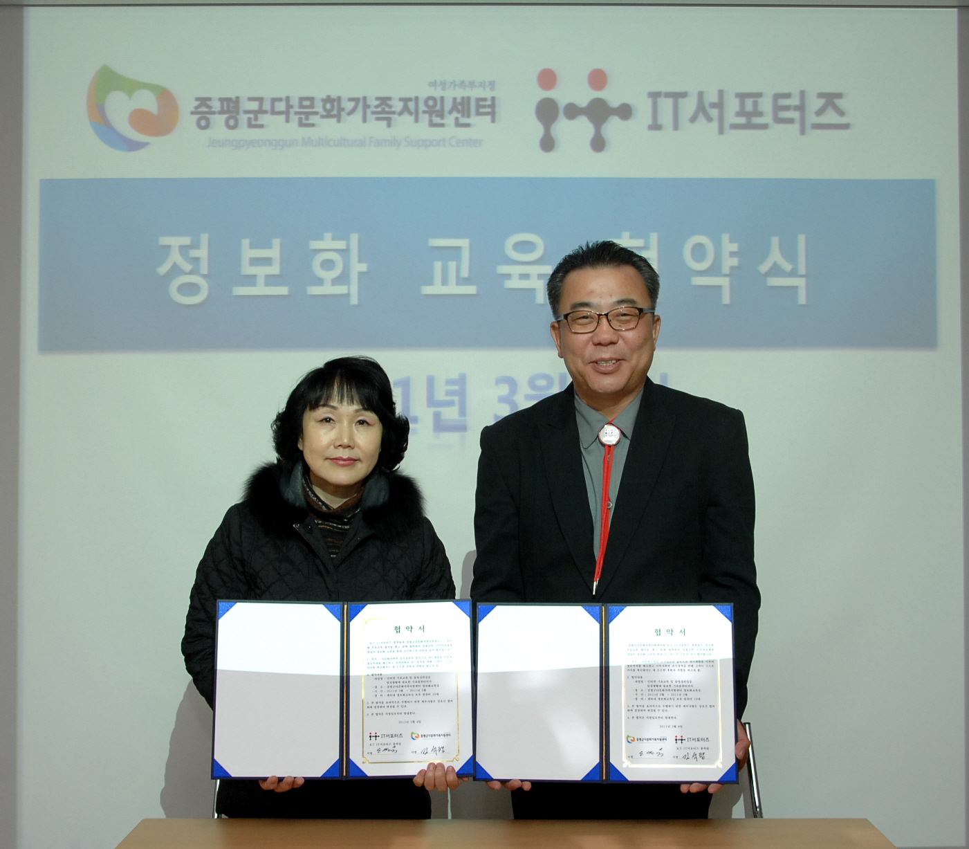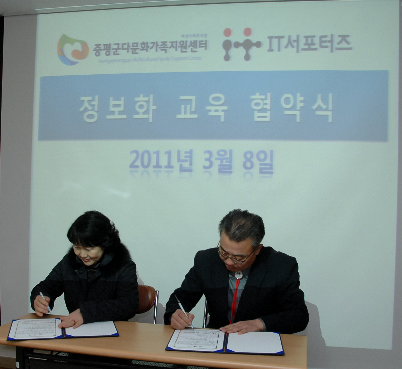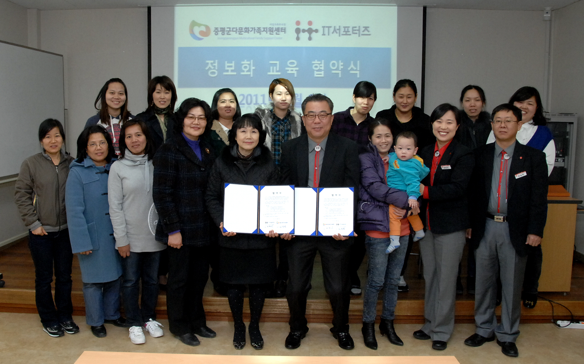 증평군 다문화가족지원센터(센터장 : 노명숙)와 KT IT서포터즈 충북팀(팀장 : 김석창)은 8일 오후 2시 증평군 다문화가족지원센터 정보화교육실에서 결혼 이주여성 정보화 교육 지원에 관한 협약을 체결했다.[보도자료실 참조]