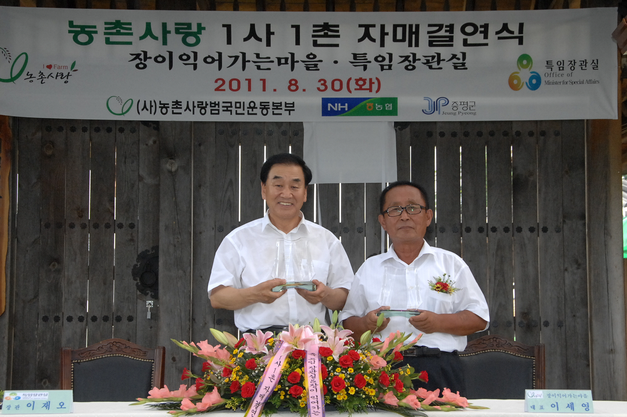 특임장관실(장관 이재오)과 충북 증평군 송산리 장이 익어가는 마을(대표 이세영)과의 ‘1사1촌 자매결연 협약식이’ 30일 오후 1시 장이 익어가는 마을 현지에서 열렸다.[보도자료실 참조]
