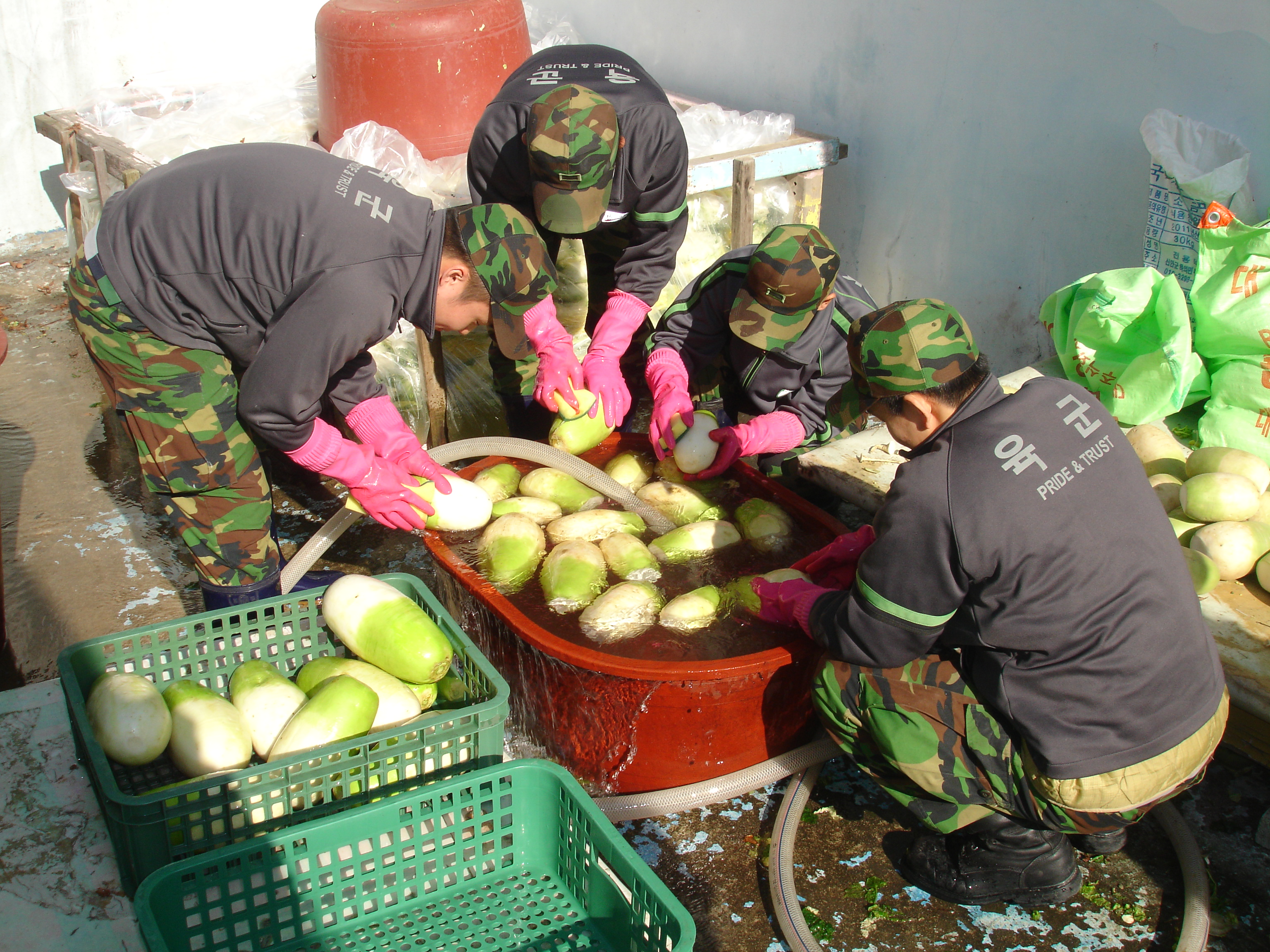 증평종합사회복지관(관장 양천공)은 5일 자원봉사자들과 37사단의 대민지원, 본푸드, 디엔피코퍼레이션, 장뜰영농조합의 도움을 받아 지역 내 어려운 이웃에게 나눠줄 김장김치 담그기를 실시했다.[증평포토포커스 참조]