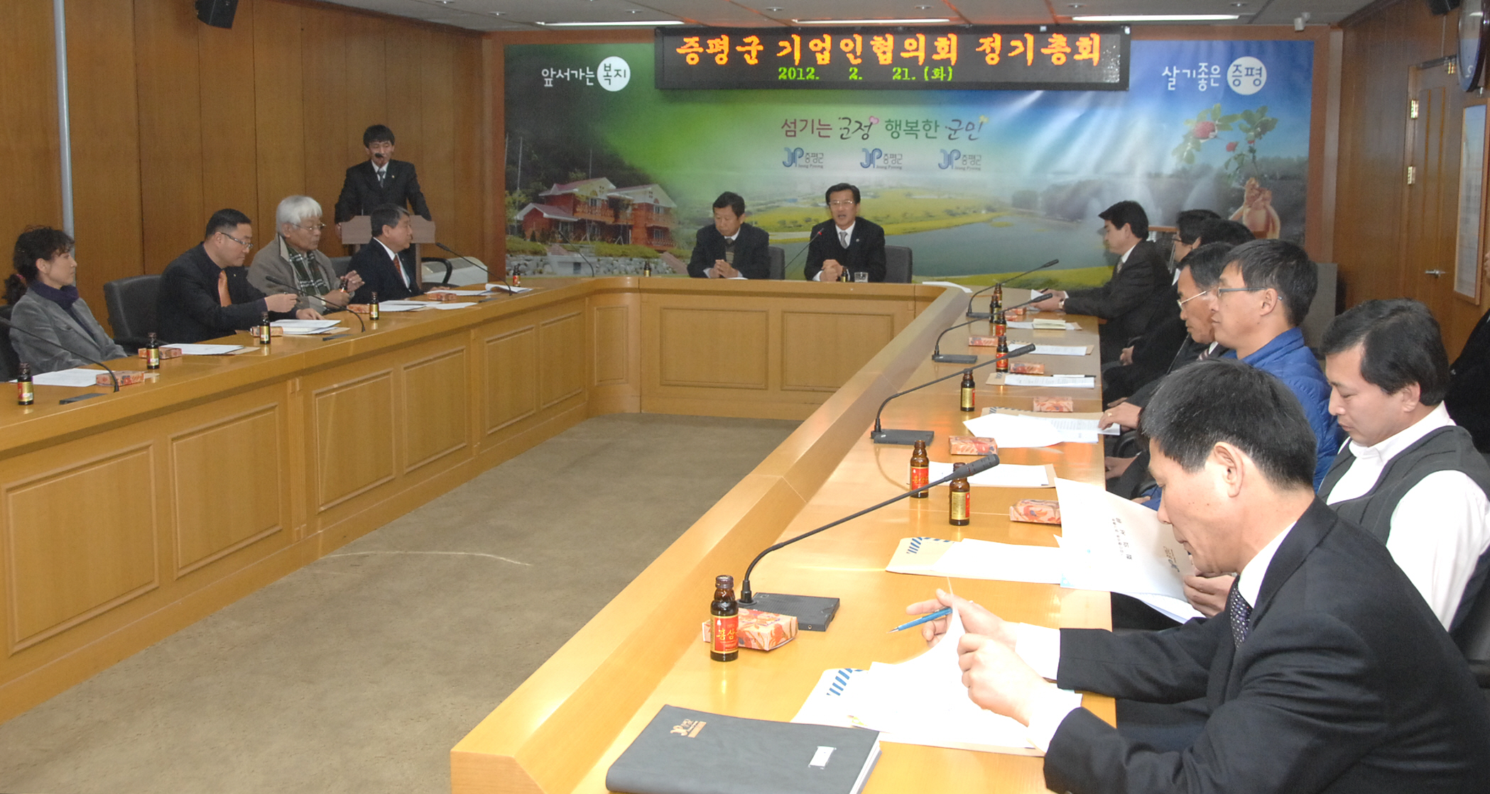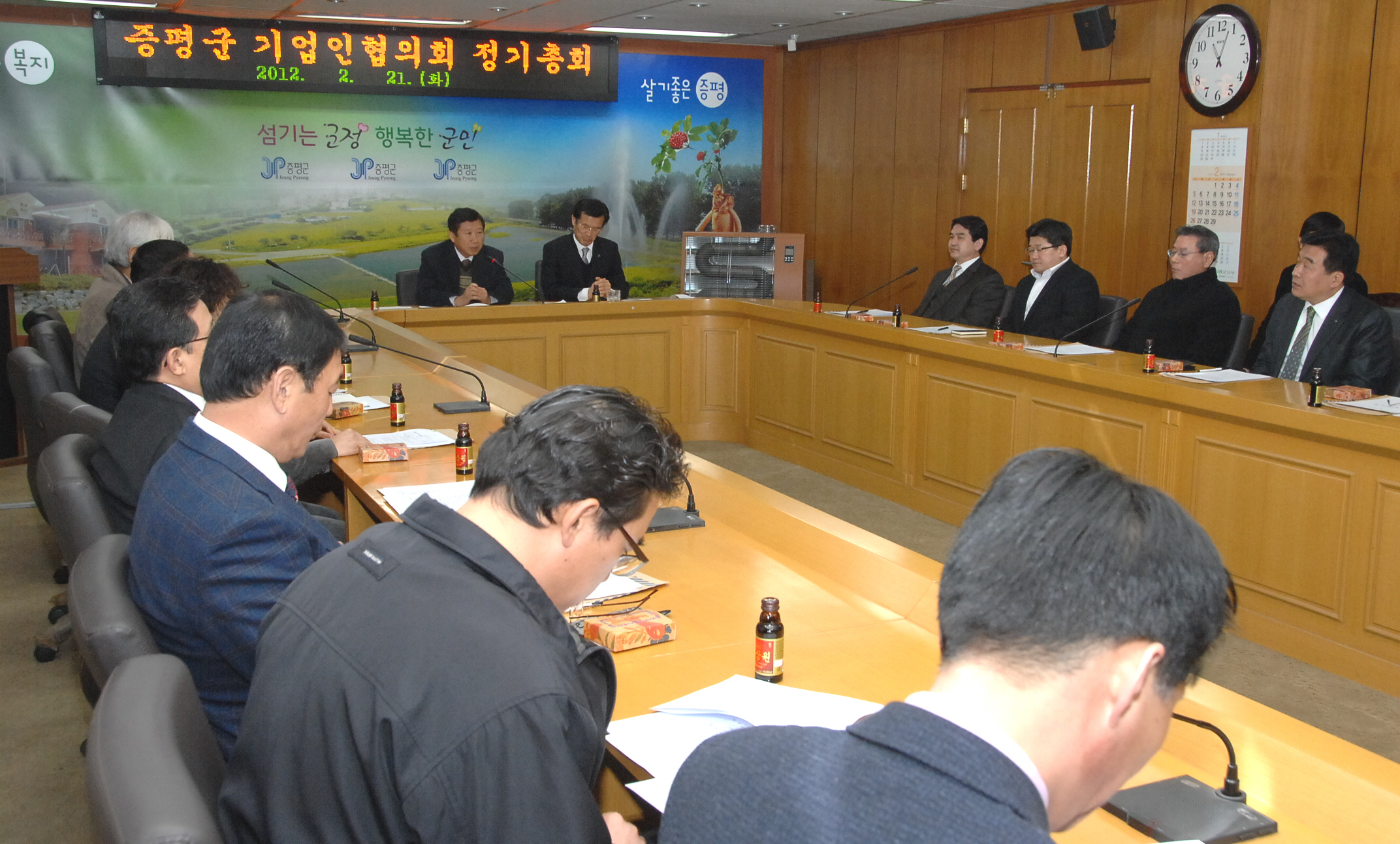 증평군 기업인 협의회(회장.장경식 성산하이텍 대표이사)는 21일 오전 11시 증평군청 2층 소회의실에서 지역 내 기업 대표 20여명이 참석한 가운데 정기총회를 갖고, 기업 간 정보교환 및 발전방향 모색했다.[보도자료실 참조]