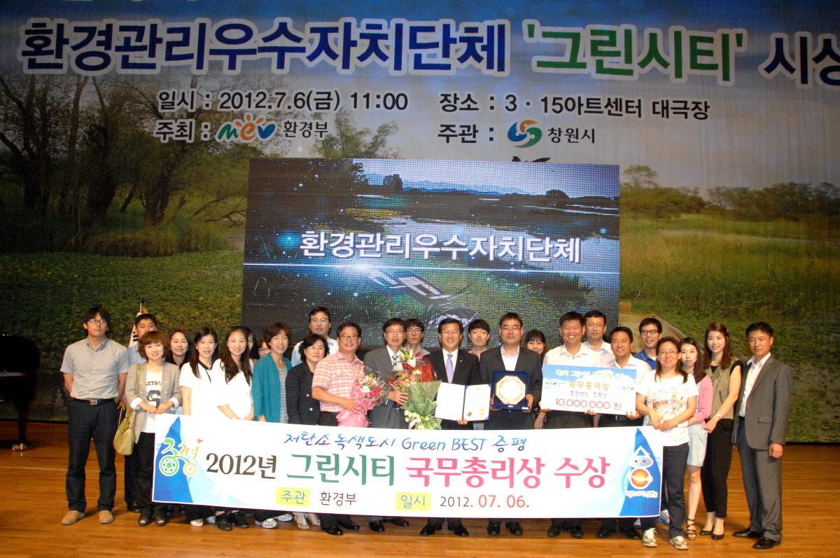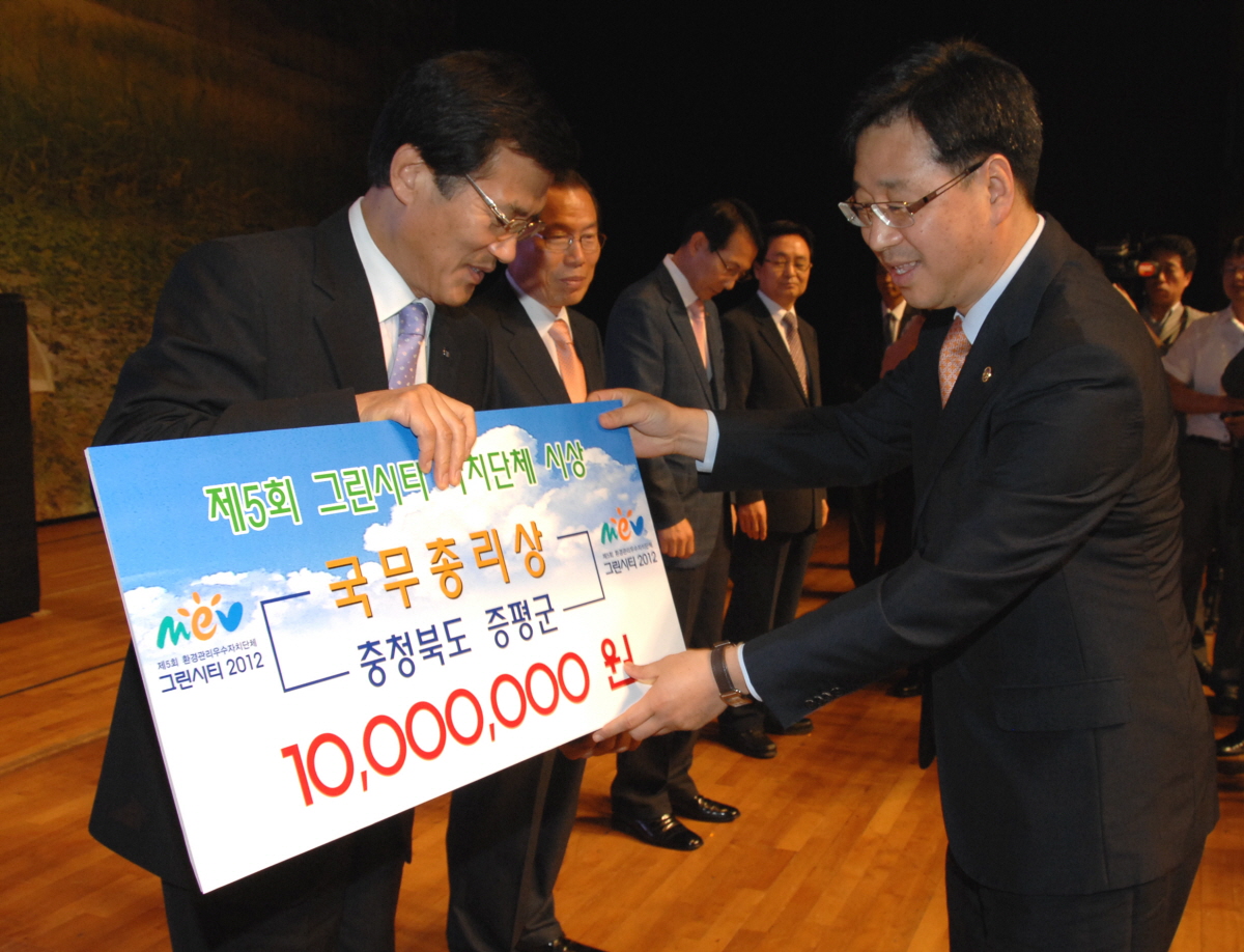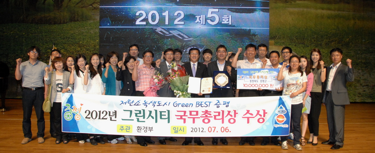 증평군이 6일 환경부 주최로 경남 창원시 3.15아트센터에서 제5회 그린시티 공모에서 환경관리 우수자치단체로 선정돼 국무총리상을 수상하는 영예를 차지했다. [보도자료실 참조]