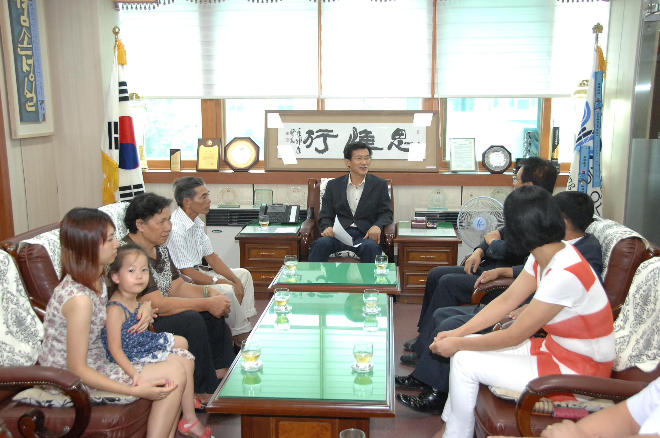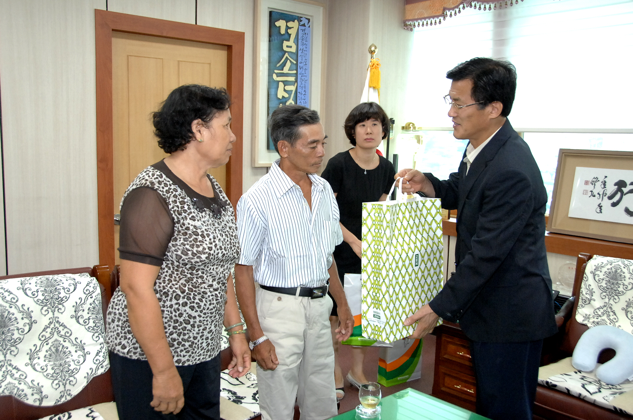 증평군에 거주하고 있는 두엉티깜(24세)씨는 고국인 베트남에서 친정부모를 초청한 가운데 남편 김대경(42세)씨와 바르게살기운동증평군협의회 임원 등 10여명과 함께 27일 오전 10시 군청을 방문해 홍성열 증평군수와 환담을 나눴다. [보도자료실 참조]