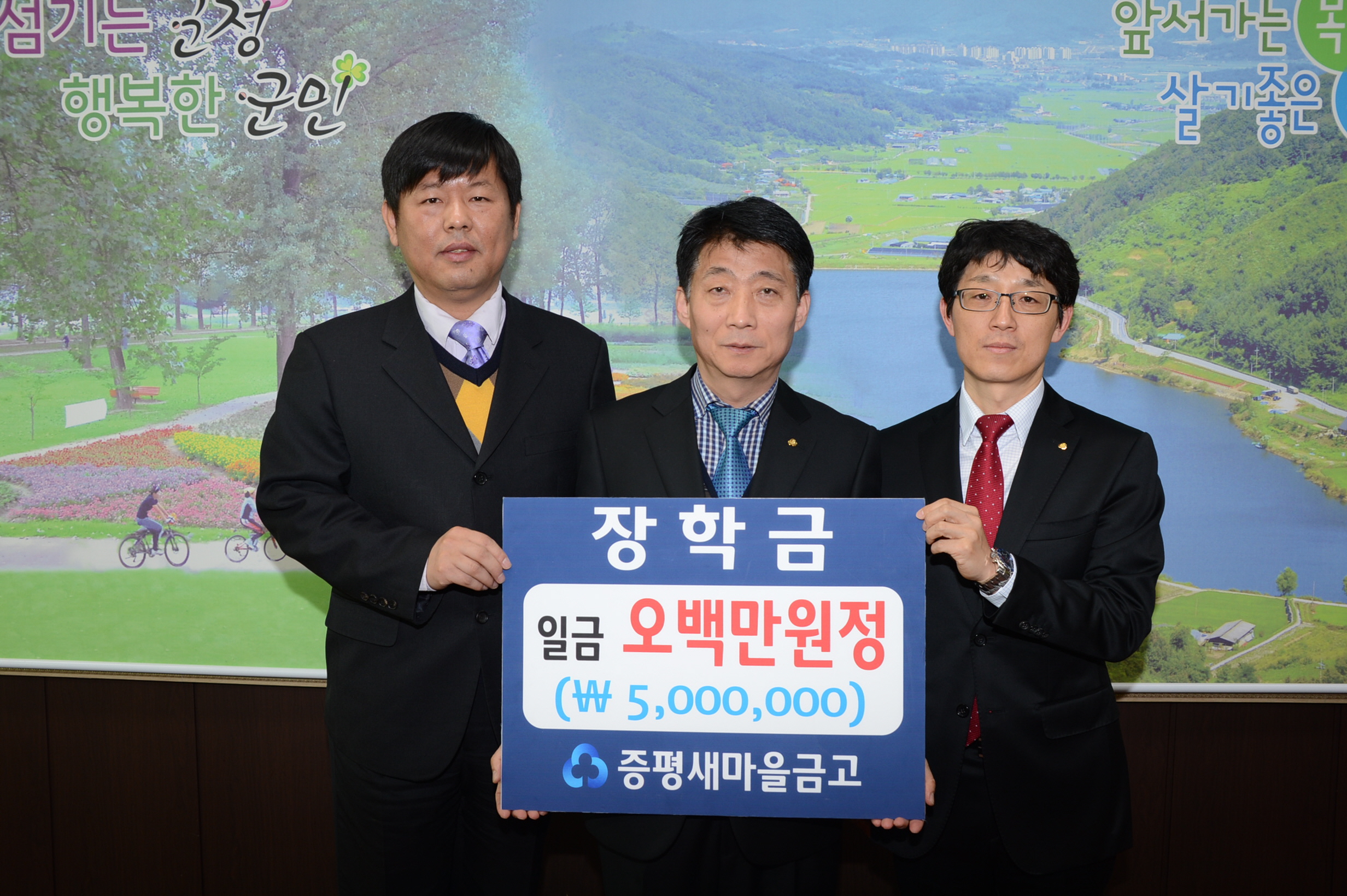 증평 새마을금고(이사장 김규환)에서 증평군의 미래를 선도할 지역인재육성을 위해 써달라며 17일 (재)증평군민장학회(이사장 홍성열 증평군수)에 500만원을 장학기금으로 기탁했다. [보도자료실 참조]