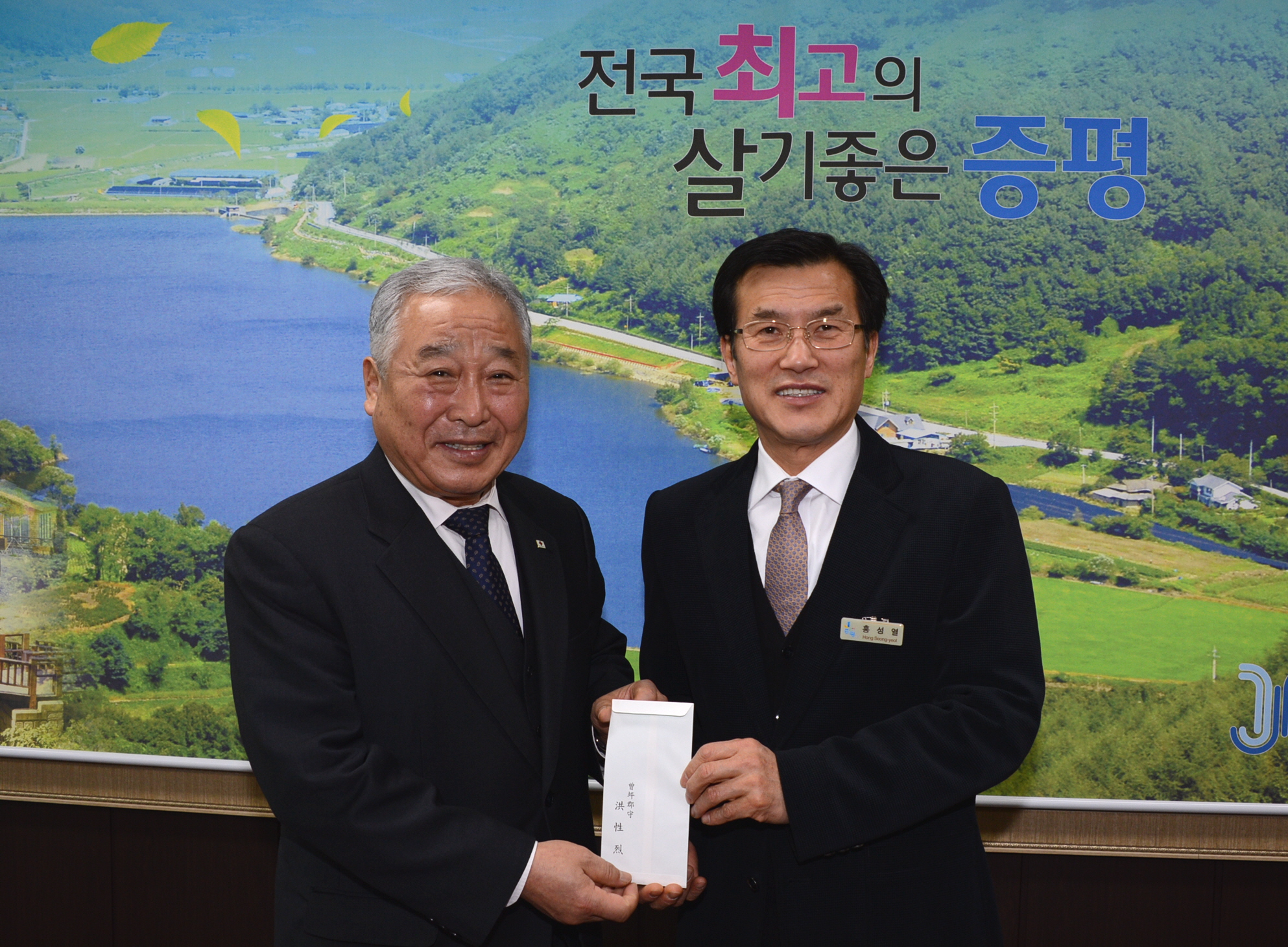홍성열 증평군수는 13일 군수실에서 성영용 대한적십자사 충북지사회장을 접견하고 2015년도 적십자 특별회비를 전달했다. [보도자료실 참조]
