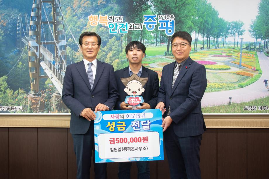 증평군 증평읍사무소 사회복지직 공무원으로 재직 중인 김원일 주무관이 ‘2018년 제13회 공공복지정책 공모전’대상 포상금 50만원을 증평군 나눔쏙쏙 연합모금에 전액 기부했다.