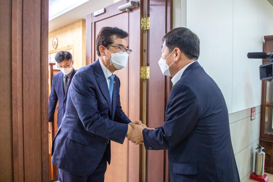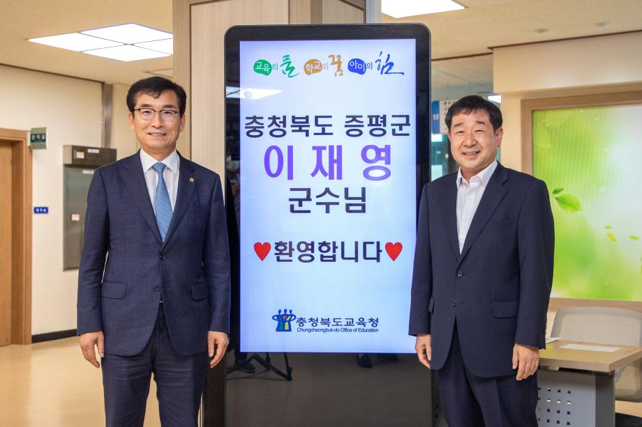 이재영 증평군수가 8일 충청북도교육청 윤건영 교육감을 만나 증평 송산지구 초등학교 신설을 위한 협력방안을 논의했다.