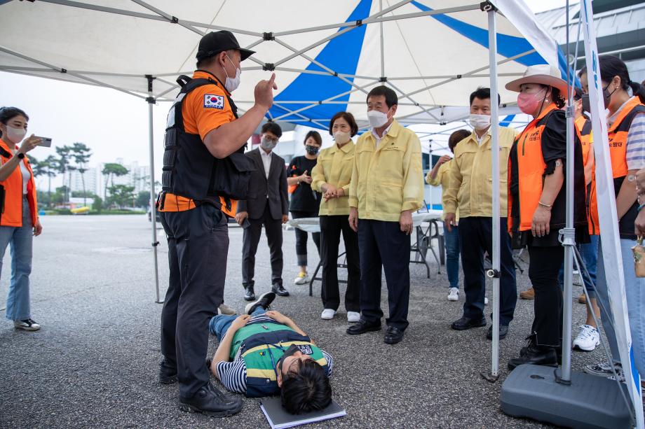 증평군이 23일 송산리 증평종합스포츠센터에서 미사일 피격을 대비한 주민대피 훈련을 실시했다.