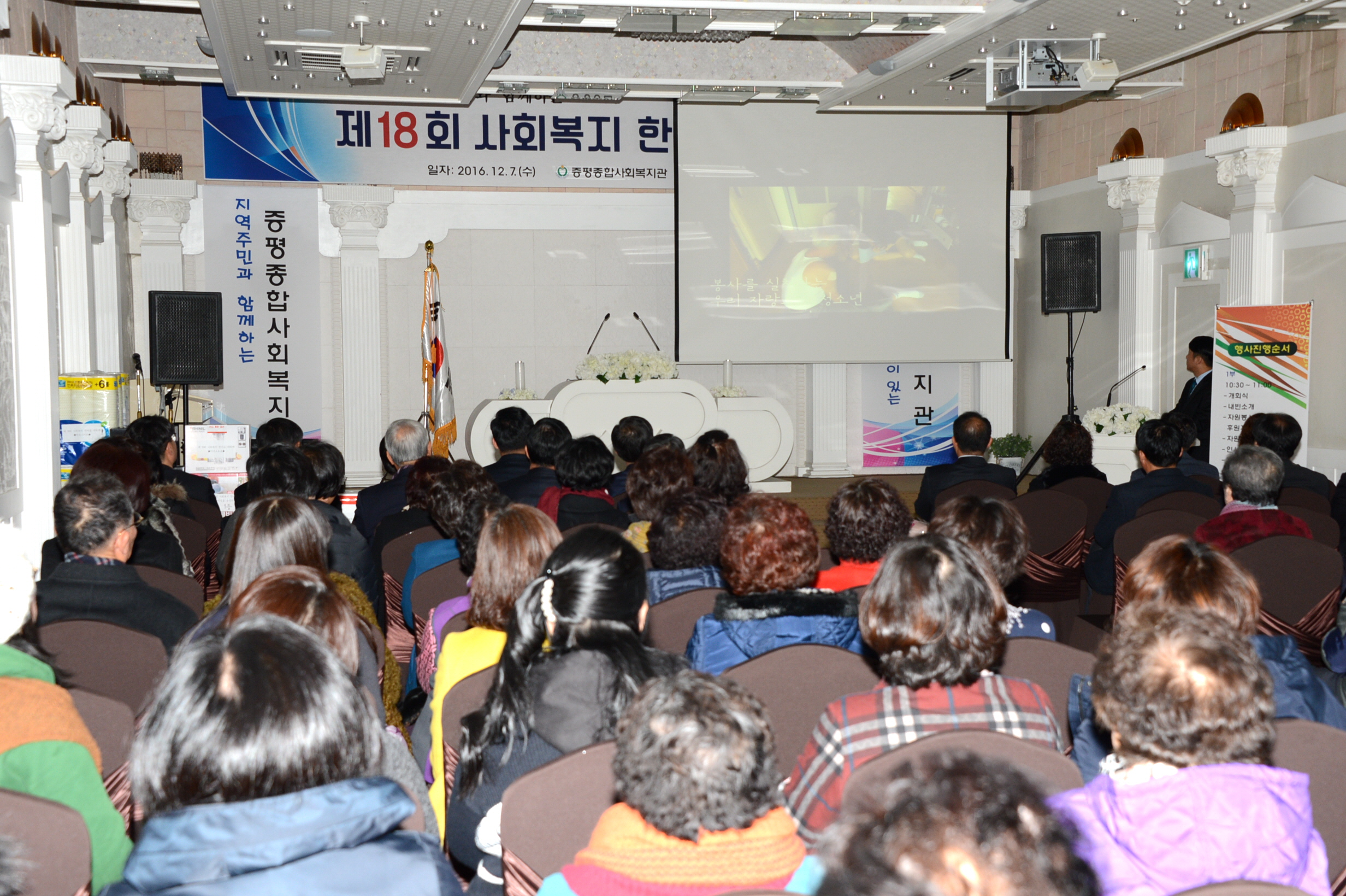 증평종합사회복지관(관장 양천공)과 삼보사회복지관(관장 이광훈)은 7일 증평 디펠리스웨딩홀에서 홍성열군수, 연종석 군의장을 비롯해 자원봉사자와 후원자 등 100여명이 참석한 가운데 제18회 사회복지 한마음대축제 행사를 개최했다.(보도자료실 참조)