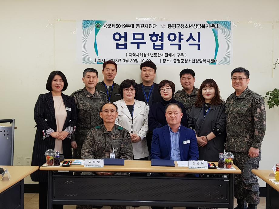 증평군청소년상담복지센터(센터장 김병노)는 육군 제5019부대 동원지원단(단장 이호재)과 군 장병들의 건전한 병영문화 정착과 교육지원을 위한 업무협약을 체결했다.(보도자료실 참조)