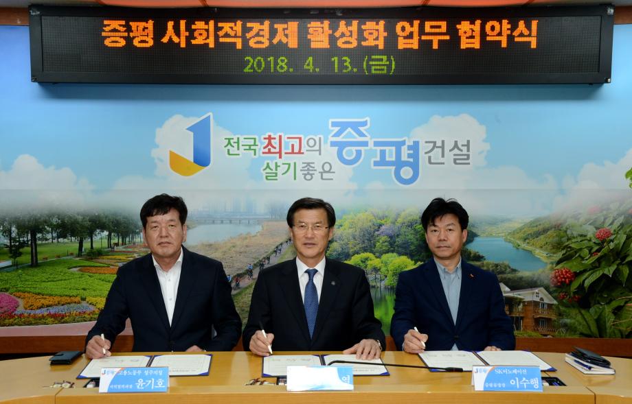 증평군은 13일 군청 소회의실에서 사회적경제 활성화를 위해 고용노동부청주고용노동지청과 SK이노베이션증평공장 간 업무협약을 체결했다.[보도자료실 참조]