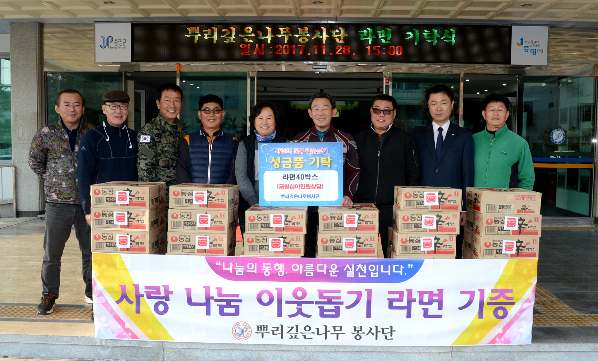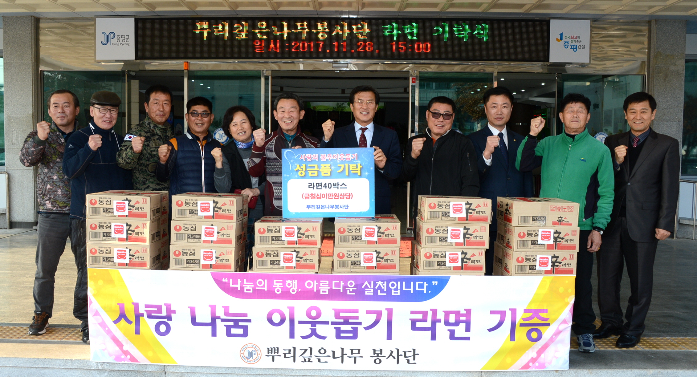 증평 뿌리깊은나무봉사단, 증평군에 라면기부로 이웃사랑 실천