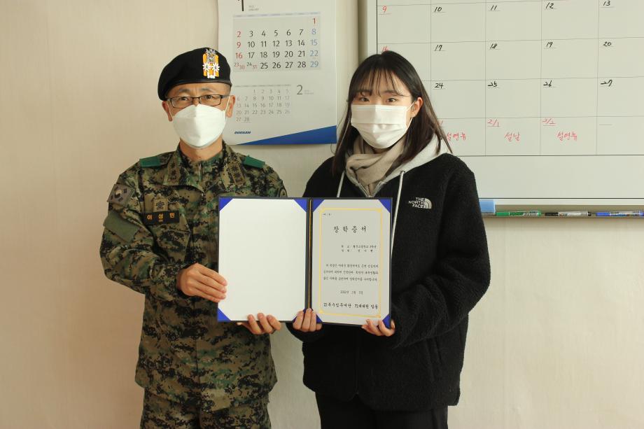13특수임무여단 71대대원 일동이 3일 증평종합사회복지관에 방문해 혼자 생활하는 어려운 환경에서 대학에 입학하는 연**(19세)학생에게 장학금 110만원을 전달했다.