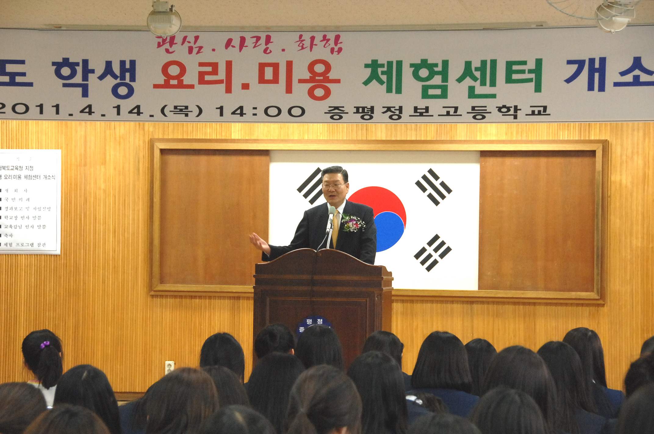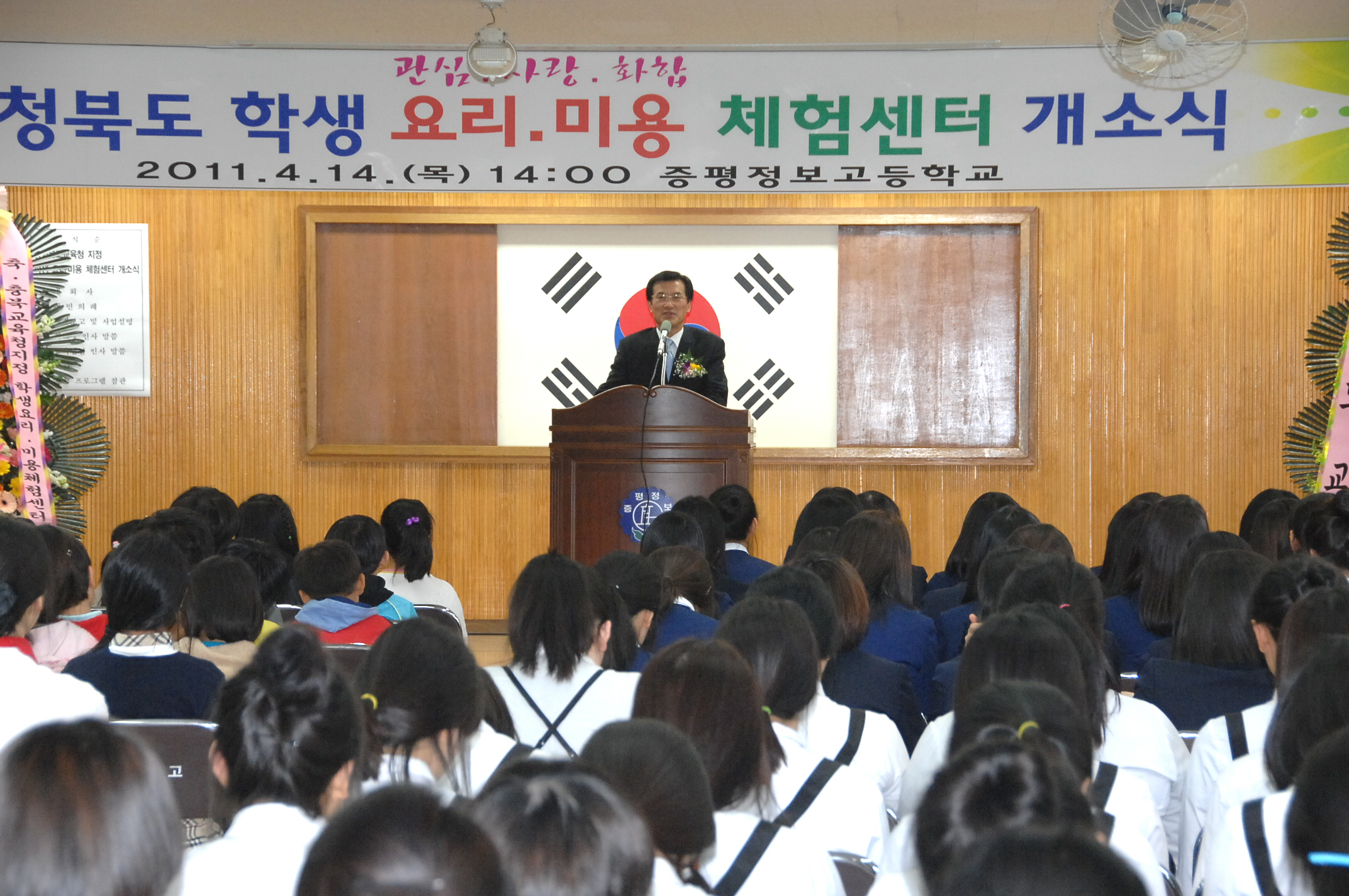 충청북도 학생 요리·미용 체험센터 개소식이 14일 증평정보고등학교(교장 이성준)에서 이기용 충청북도 교육감, 홍성열 증평군수, 김재룡 증평군의장, 김재종 한국음식업중앙회 충청북도지회장, 오수희 대한미용사회 충북지부장을 비롯한 도내 각 지역 교육장과 학교운영위원 등이 참석한 가운데 열렸다. [보도자료실 참조]