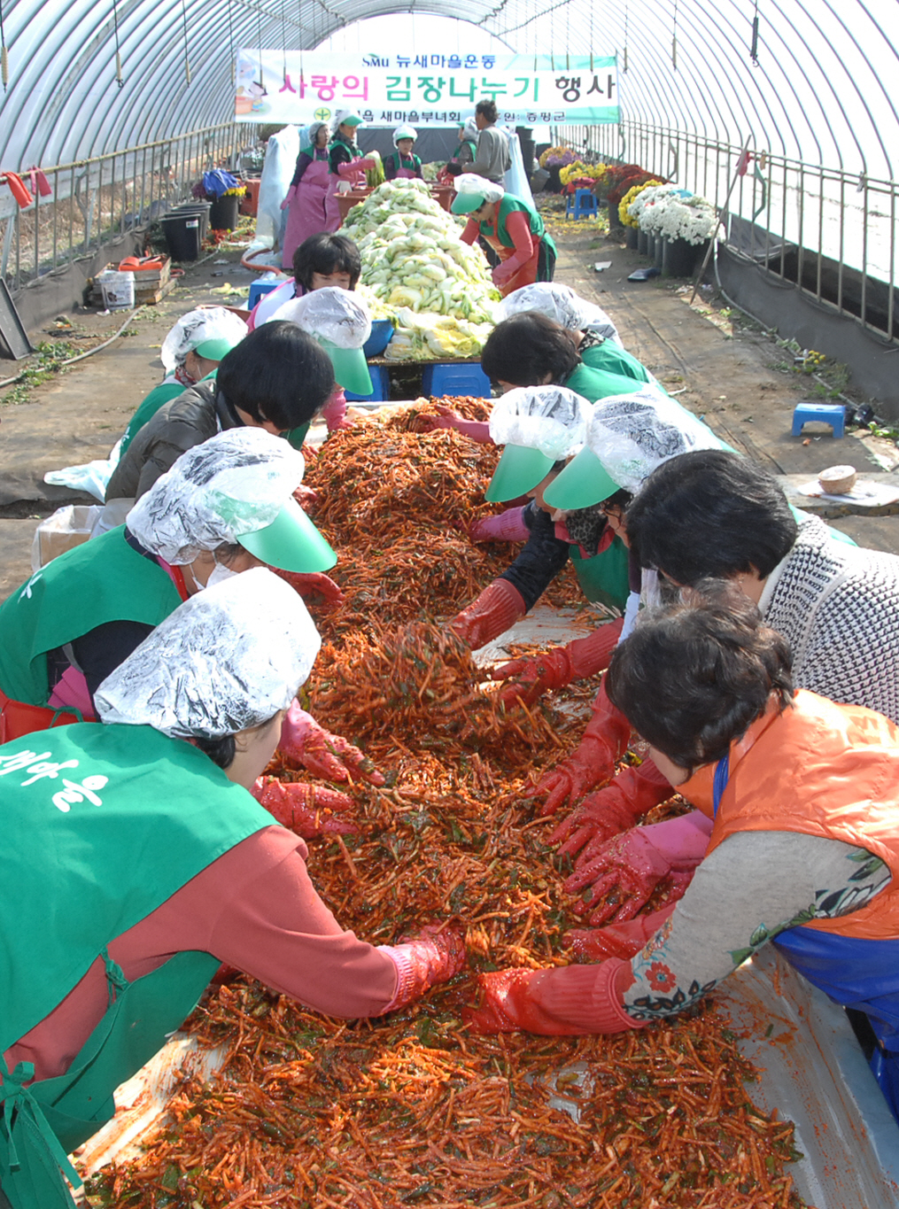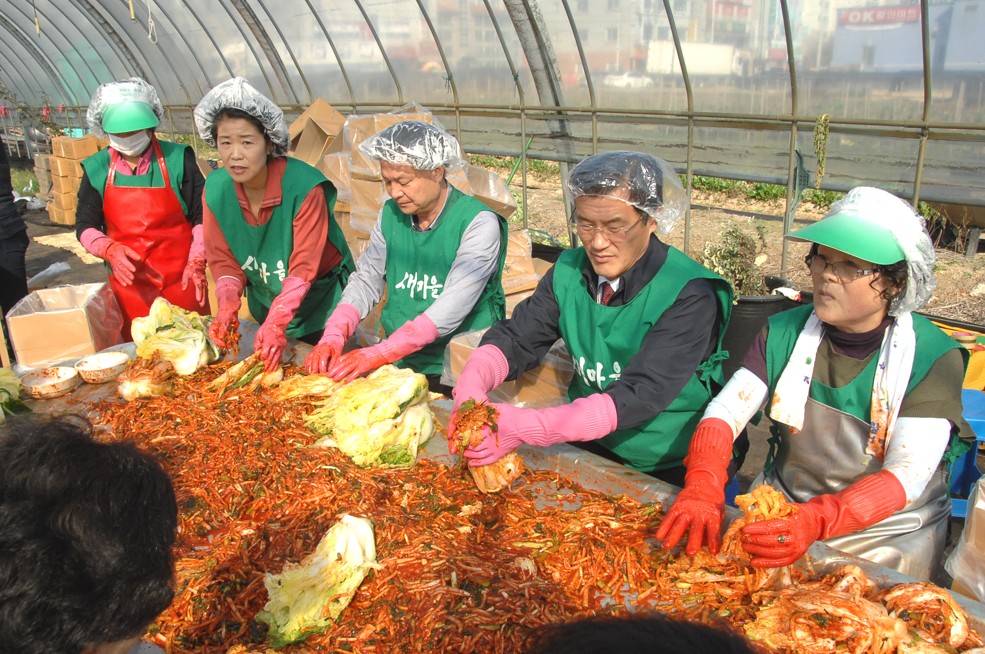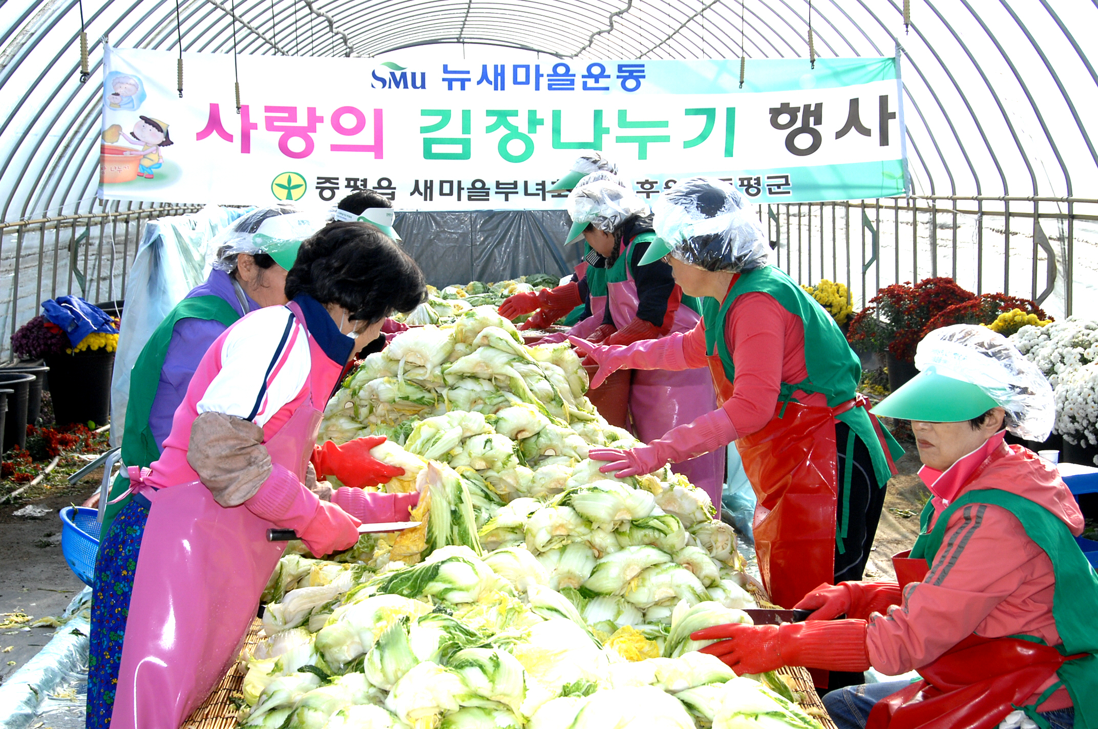 증평군새마을회부녀회(회장 김묘현)는 14부터 15일까지 증평군여성회관 옆 꽃묘장하우스에서 지역의 어려운 이웃을 돕기 위한 ‘2011 김장나누기’ 행사를 펼쳤다. 사진은 홍성열군수와 박성현새마을회장 등 임원진 김장을 담그는 모습 [증평포토포커스 참조]
