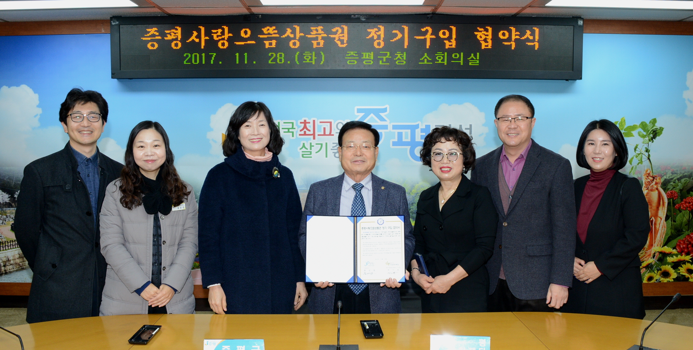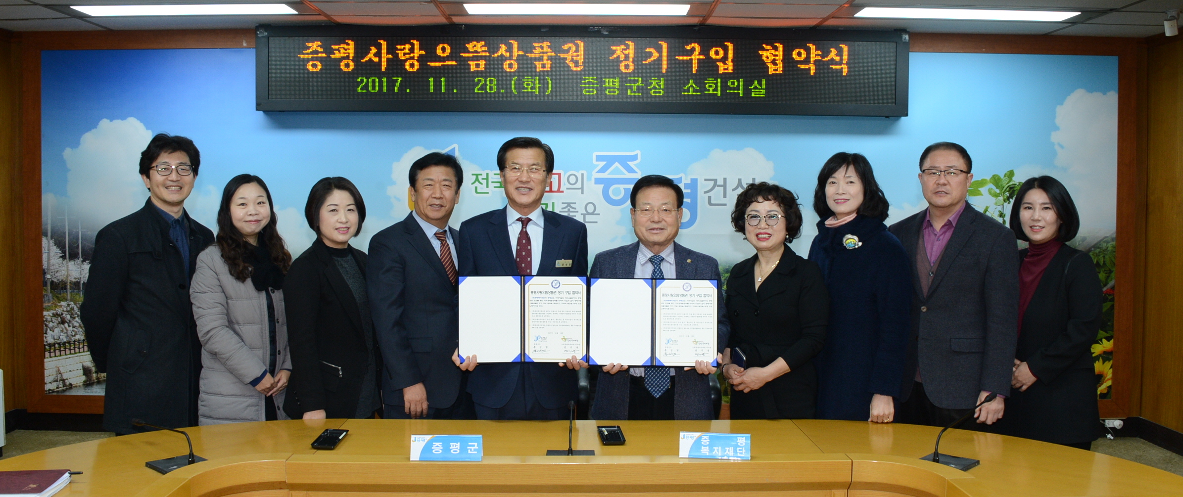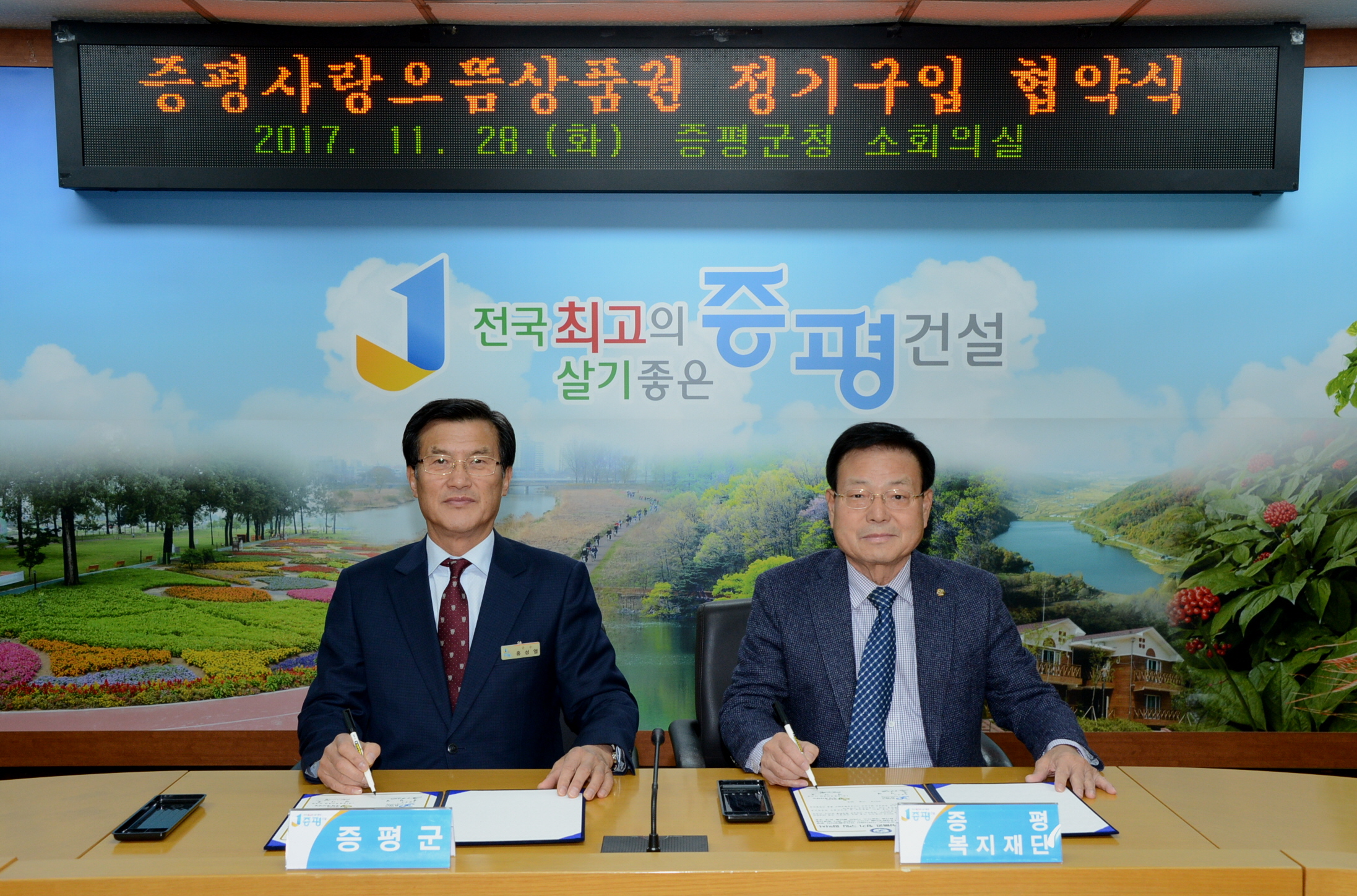 증평군과 (재)증평복지재단(이사장 연기봉)이 28일 군청 소회의실에서 증평사랑으뜸상품권 정기구입 협약을 체결했다.(보도자료실 참조)