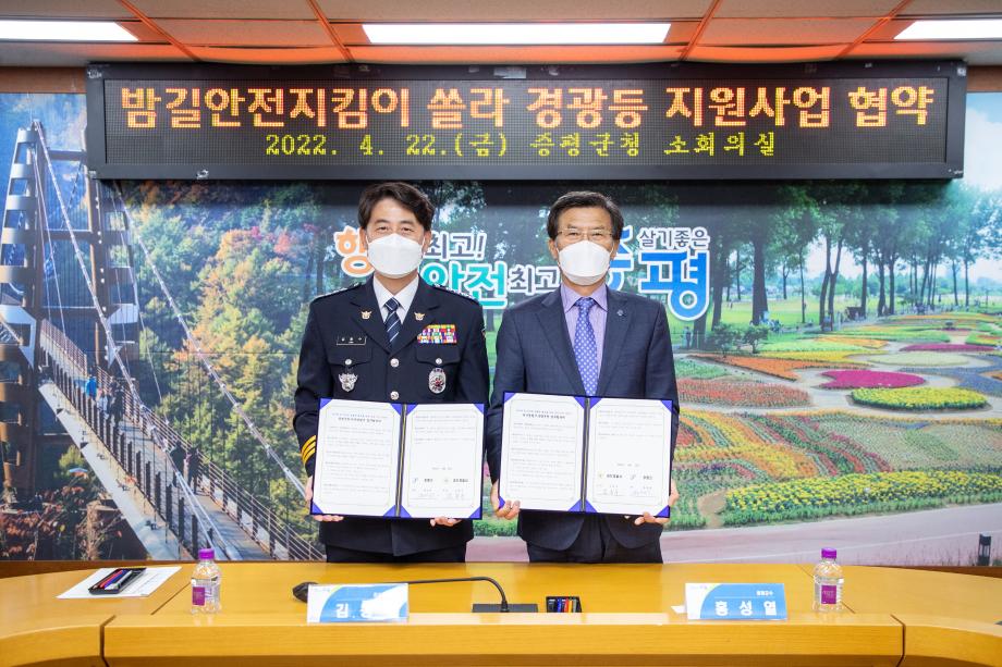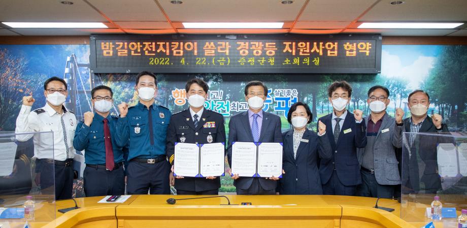 증평군과 괴산경찰서는 22일 증평군청 소회의실에서 밤길 안전 지킴이 쏠라경광등 지원을 위한 업무 협약을 맺었다.