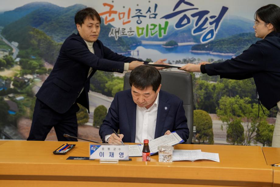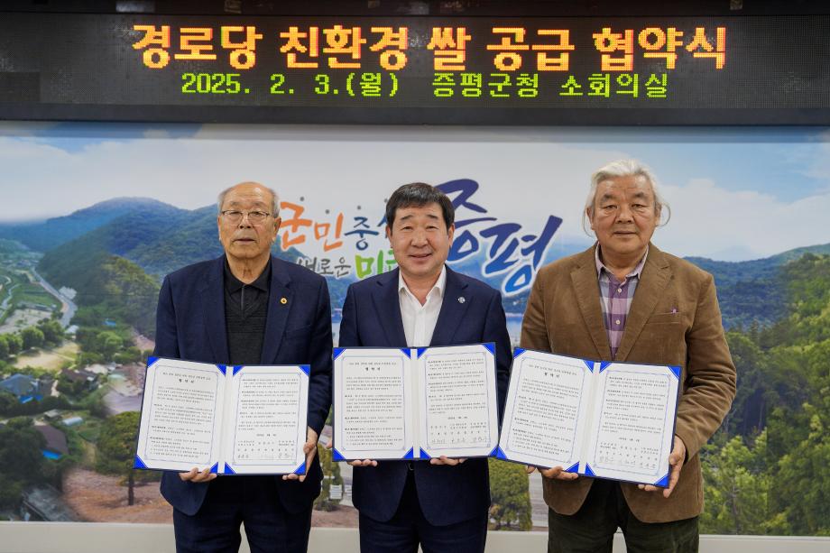 충북 증평군이 3일 군청 소회의실에서 (사)대한노인회증평군지회(회장 연훈흠), 증평친환경영농조합법인(대표 정창수)과 지역 내 경로당 친환경 쌀 공급을 위한 협약을 체결했다.