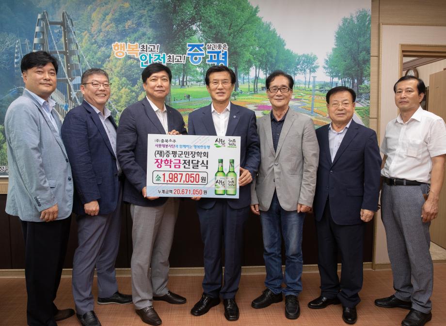 (주)충북소주(대표 김태환)가 (재)증평군민장학회(이사장 홍성열 증평군수)에 장학사업을 위한 장학기금 198만7050원을