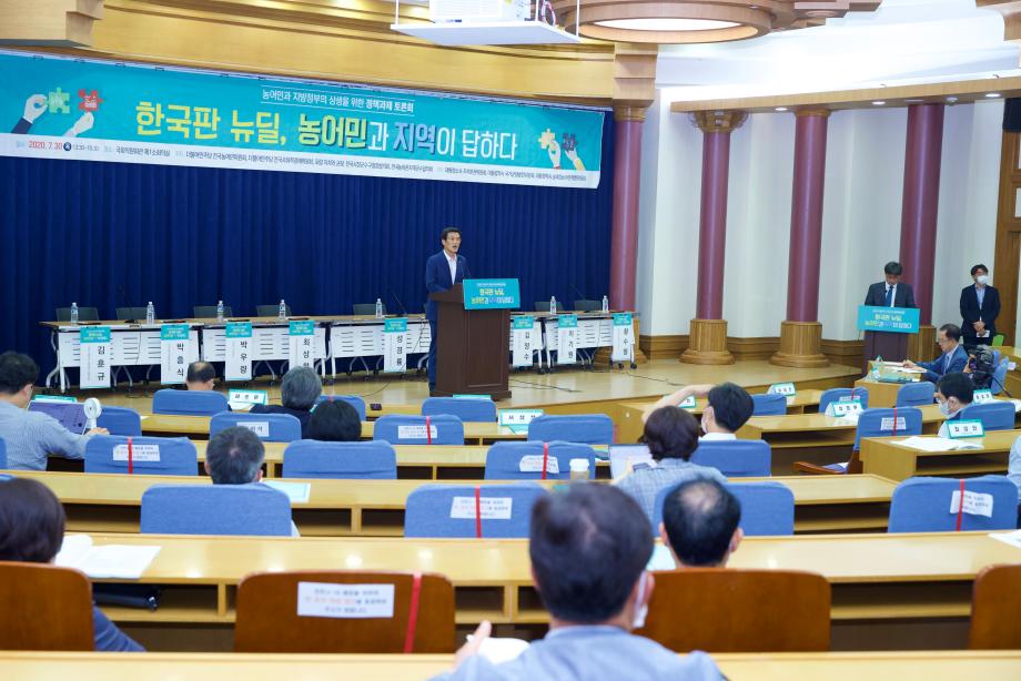 전국농어촌지역군수협의회(회장 홍성열 증평군수), 전국농어민위원회(위원장 위성곤 국회의원), 대통령소속 자치분권위원회(위원장 김순은), 국가균형발전위원회(위원장 김사열), 농어업농어촌특별위원회(위원장 정현찬)는 7월 30일 서울 영등포구 국회의사당 국회의원회관 제1소회의실에‘한국판 뉴딜, 농어민과 지역이 답하다’라는 주제로 토론회를 개최했다.