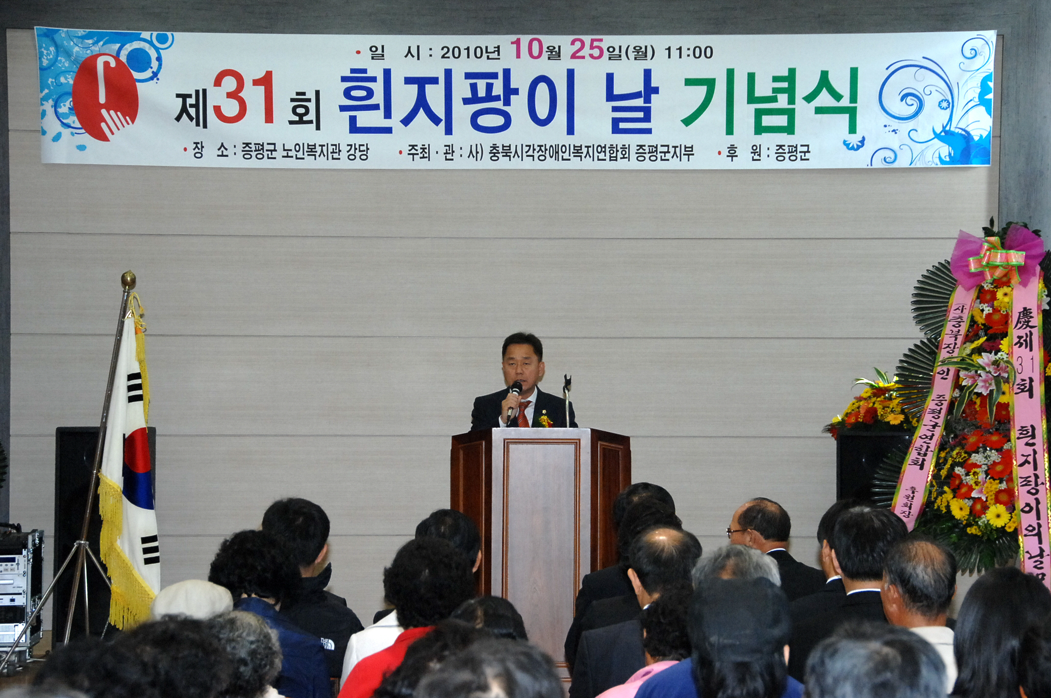 충북시각장애인복지연합회 증평군지부가 주관하는 제31회 흰 지팡이 날 기념식이 25일 오전 11시 증평군 노인복지관 2층 대강당에서 지역 내 시각장애인과 기관단체장 및 도내 시각장애인복지연합회 각 지부장, 도연합회 관계자 150여명이 참석한 가운데 열렸다.[보도자료실 참조]