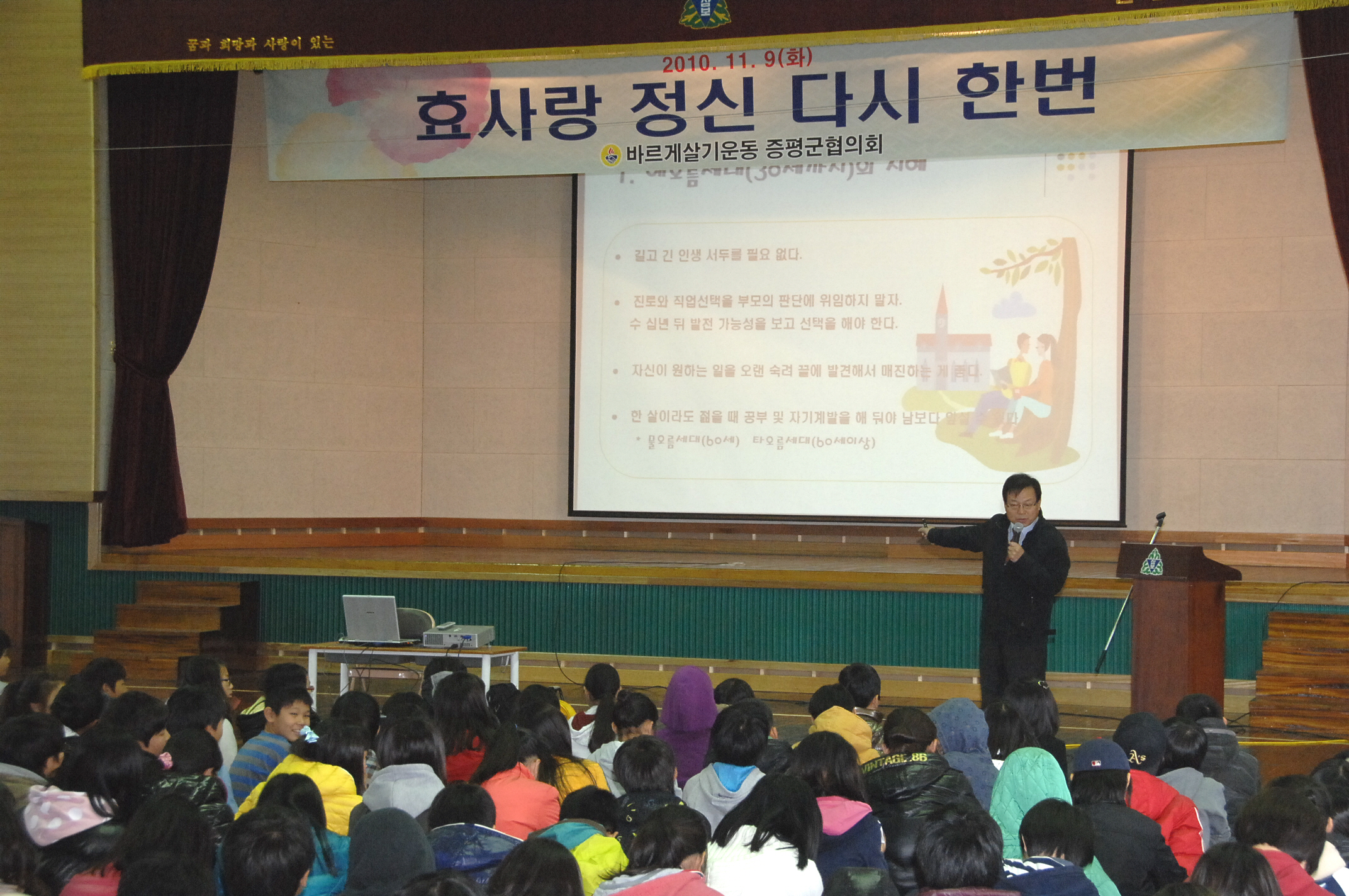 바르게살기운동증평군협의회(회장 변종림. 이하 바르게)은 9일 오전 11시 삼보초등학교 강당에서 5,6학년 재학생 200여명이 참석한 가운데 ‘아름다운 어린이-효’라는 주제로 효사랑 강연회를 개최했다.[보도자료실 참조]